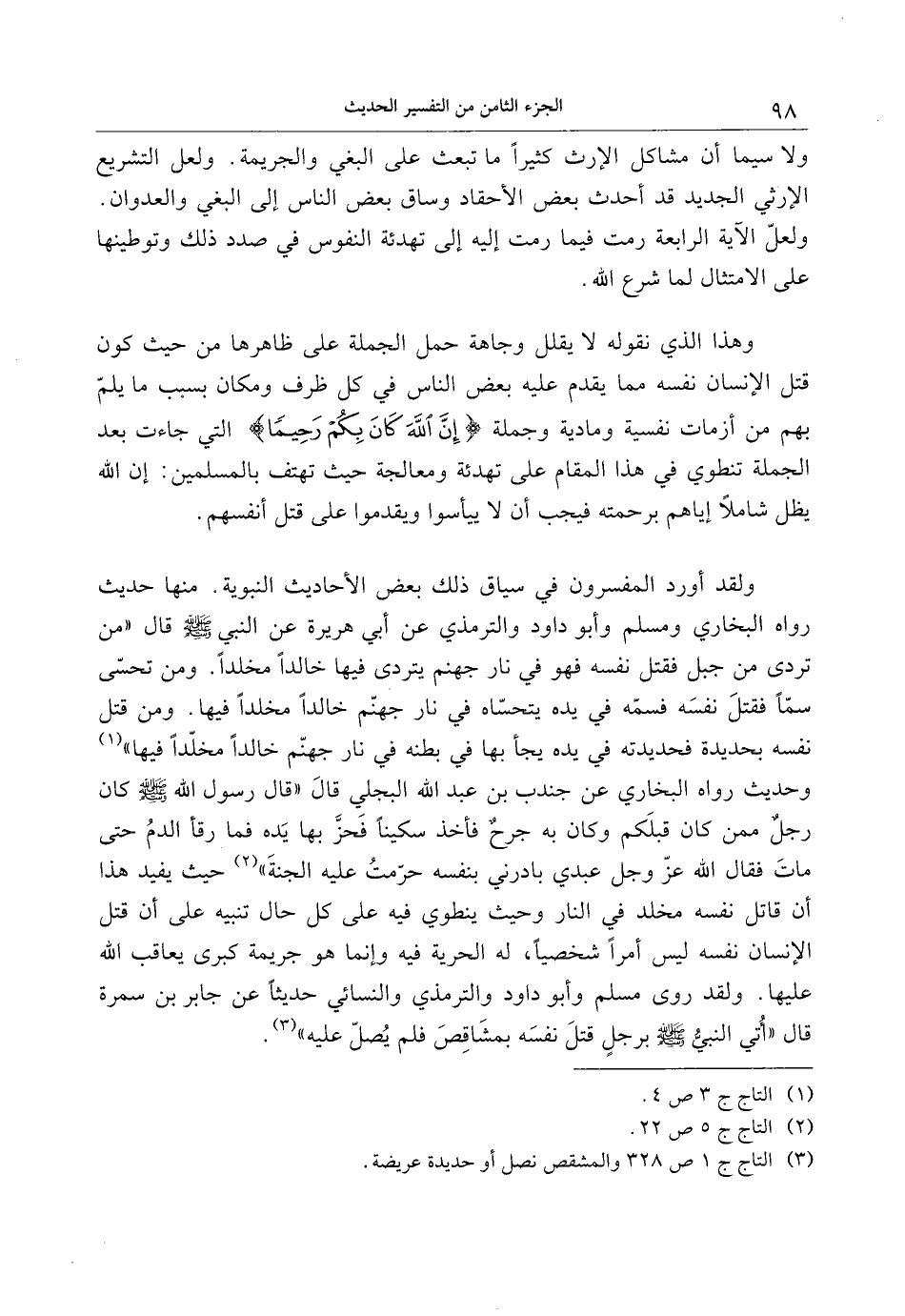 ولقد أورد المفسرون في سياق ذلك بعض الأحاديث النبوية. منها حديث رواه البخاري ومسلم وأبو داود والترمذي عن أبي هريرة عن النبي صلى الله عليه وسلم قال «من تردى من جبل فقتل نفسه فهو في نار جهنم يتردى فيها خالدا مخلدا. ومن تحسّى سمّا فقتل نفسه فسمّه في يده يتحسّاه في نار جهنّم خالدا مخلدا فيها. ومن قتل نفسه بحديدة فحديدته في يده يجأ بها في بطنه في نار جهنّم خالدا مخلّدا فيها» «1» وحديث رواه البخاري عن جندب بن عبد الله البجلي قال «قال رسول الله صلى الله عليه وسلم كان رجل ممن كان قبلكم وكان به جرح فأخذ سكينا فحزّ بها يده فما رقأ الدم حتى مات فقال الله عزّ وجل عبدي بادرني بنفسه حرّمت عليه الجنة» «2» حيث يفيد هذا أن قاتل نفسه مخلد في النار وحيث ينطوي فيه على كل حال تنبيه على أن قتل الإنسان نفسه ليس أمرا شخصيا، له الحرية فيه وإنما هو جريمة كبرى يعاقب الله عليها. ولقد روى مسلم وأبو داود والترمذي والنسائي حديثا عن جابر بن سمرة قال «أتي النبيّ صلى الله عليه وسلم برجل قتل نفسه بمشاقص فلم يصلّ عليه» «3» .
