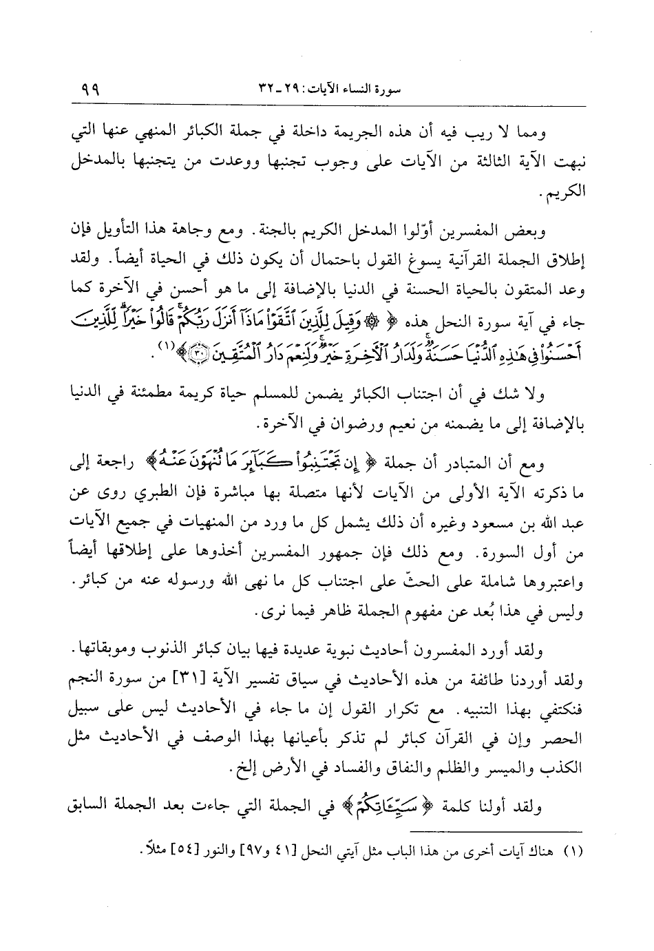 ومع أن المتبادر أن جملة إِنْ تَجْتَنِبُوا كَبائِرَ ما تُنْهَوْنَ عَنْهُ راجعة إلى ما ذكرته الآية الأولى من الآيات لأنها متصلة بها مباشرة فإن الطبري روى عن عبد الله بن مسعود وغيره أن ذلك يشمل كل ما ورد من المنهيات في جميع الآيات من أول السورة. ومع ذلك فإن جمهور المفسرين أخذوها على إطلاقها أيضا واعتبروها شاملة على الحثّ على اجتناب كل ما نهى الله ورسوله عنه من كبائر.