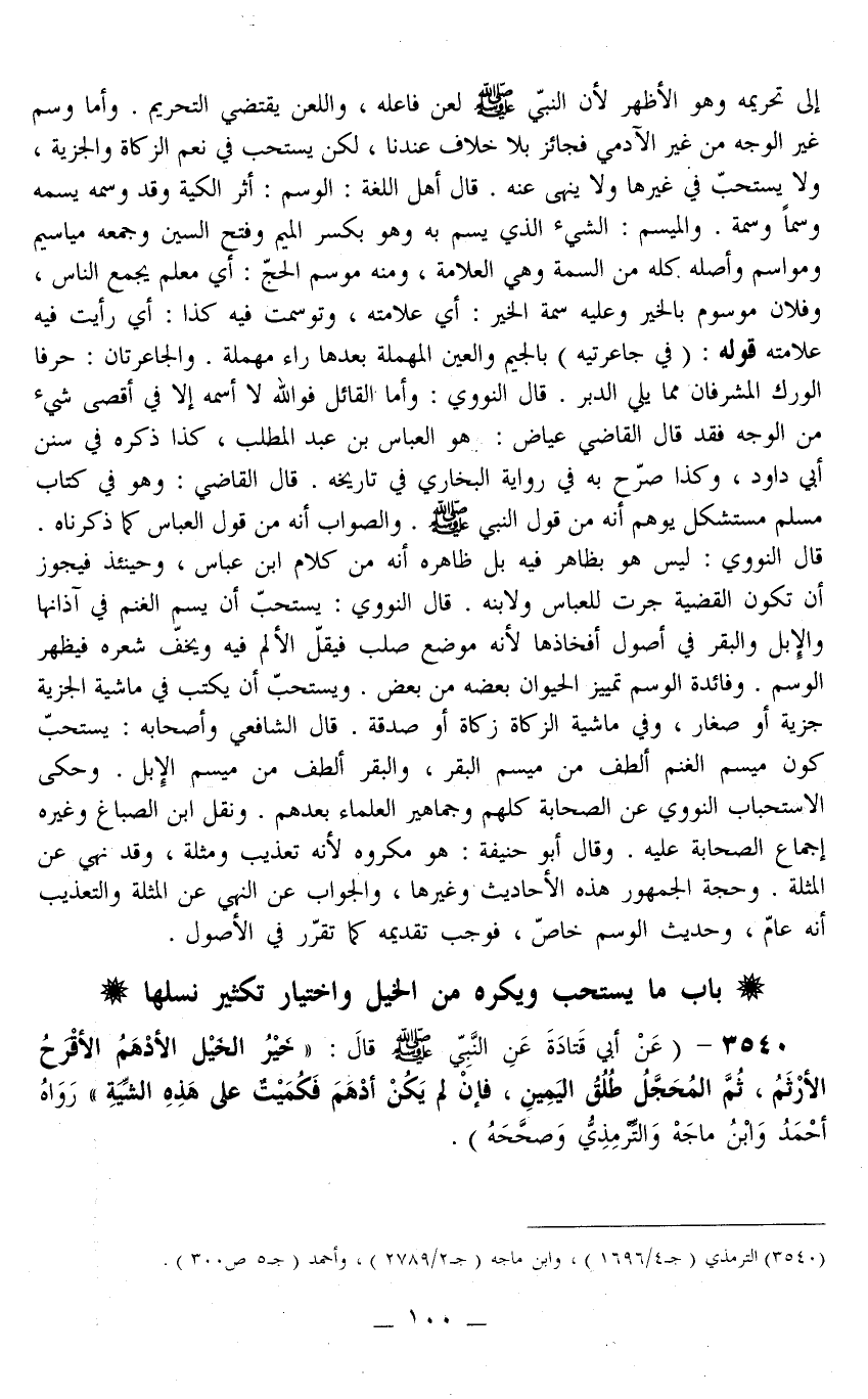 وَفَائِدَةُ الْوَسْمِ تَمْيِيزُ الْحَيَوَانِ بَعْضُهُ مِنْ بَعْضٍ. وَيُسْتَحَبُّ أَنْ يَكْتُبَ فِي مَاشِيَةِ الْجِزْيَةِ جِزْيَةٌ أَوْ صِغَارٌ، وَفِي مَاشِيَةِ الزَّكَاةِ زَكَاةٌ أَوْ صَدَقَةٌ. قَالَ الشَّافِعِيُّ وَأَصْحَابُهُ: يُسْتَحَبُّ كَوْنُ مِيسَمِ الْغَنَمِ أَلْطَفَ مِنْ مِيسَمِ الْبَقَرِ، وَالْبَقَرُ أَلْطَفَ مِنْ مِيسَمِ الْإِبِلِ. وَحَكَى الِاسْتِحْبَابَ النَّوَوِيُّ عَنْ الصَّحَابَةِ كُلِّهِمْ وَجَمَاهِيرِ الْعُلَمَاءِ بَعْدَهُمْ. وَنَقَلَ ابْنُ الصَّبَّاغِ وَغَيْرُهُ إجْمَاعَ الصَّحَابَةِ عَلَيْهِ. وَقَالَ أَبُو حَنِيفَةَ: هُوَ مَكْرُوهٌ لِأَنَّهُ تَعْذِيبٌ وَمُثْلَةٌ، وَقَدْ نُهِيَ عَنْ الْمُثْلَةِ. وَحُجَّةُ الْجُمْهُورِ هَذِهِ الْأَحَادِيثُ وَغَيْرُهَا، وَالْجَوَابُ عَنْ النَّهْيِ عَنْ الْمُثْلَةِ وَالتَّعْذِيبِ أَنَّهُ عَامٌّ، وَحَدِيثُ الْوَسْمِ خَاصٌّ، فَوَجَبَ تَقْدِيمُهُ كَمَا تَقَرَّرَ فِي الْأُصُولِ