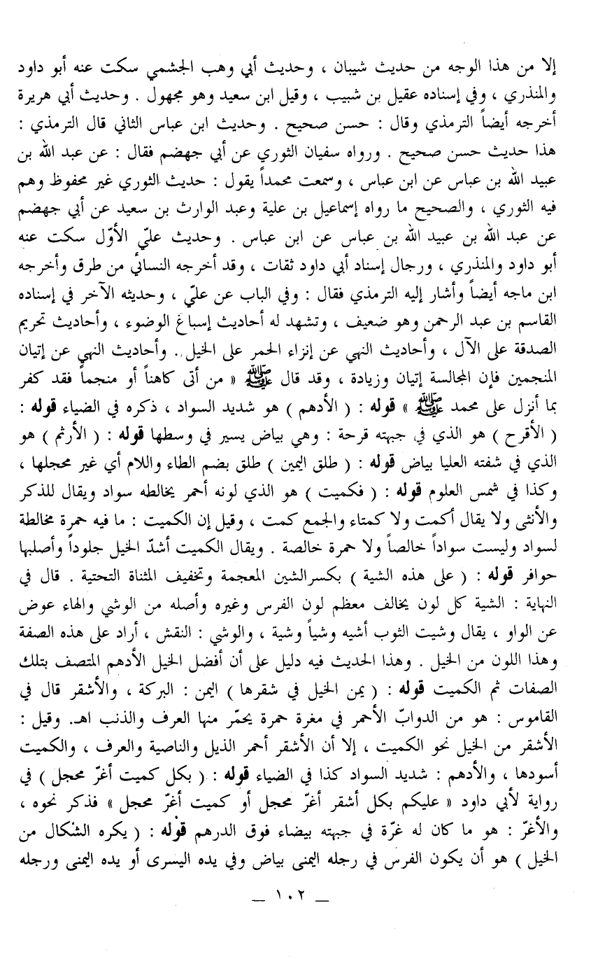 وَحَدِيثُ ابْنِ عَبَّاسٍ الثَّانِي قَالَ التِّرْمِذِيُّ: هَذَا حَدِيثٌ حَسَنٌ صَحِيحٌ. وَرَوَاهُ سُفْيَانُ الثَّوْرِيُّ عَنْ أَبِي جَهْضَمٍ فَقَالَ: عَنْ عَبْدِ اللَّهِ بْنِ عُبَيْدِ اللَّهِ بْنِ عَبَّاسٍ عَنْ ابْنِ عَبَّاسٍ، وَسَمِعْتُ مُحَمَّدًا يَقُولُ: حَدِيثُ الثَّوْرِيِّ غَيْرُ مَحْفُوظٍ وَهِمَ فِيهِ الثَّوْرِيُّ، وَالصَّحِيحُ مَا رَوَاهُ إسْمَاعِيلُ ابْنُ عُلَيَّةَ وَعَبْدُ الْوَارِثِ بْنُ سَعِيدٍ عَنْ أَبِي جَهْضَمٍ عَنْ عَبْدِ اللَّهِ بْنِ عُبَيْدِ اللَّهِ بْنِ عَبَّاسٍ عَنْ ابْنِ عَبَّاسٍ وَحَدِيثُ عَلِيٍّ الْأَوَّلُ سَكَتَ عَنْهُ أَبُو دَاوُد وَالْمُنْذِرِيُّ، وَرِجَالُ إسْنَادِ أَبِي دَاوُد ثِقَاتٌ، وَقَدْ أَخْرَجَهُ النَّسَائِيّ مِنْ طُرُقٍ وَأَخْرَجَهُ ابْنُ مَاجَهْ أَيْضًا وَأَشَارَ إلَيْهِ التِّرْمِذِيُّ فَقَالَ: وَفِي الْبَابِ عَنْ عَلِيٍّ، وَحَدِيثُهُ الْآخَرُ فِي إسْنَادِهِ الْقَاسِمُ بْنُ عَبْدِ الرَّحْمَنِ وَهُوَ ضَعِيفٌ، وَتَشْهَدُ لَهُ أَحَادِيثُ إسْبَاغِ الْوُضُوءِ، وَأَحَادِيثُ تَحْرِيمِ الصَّدَقَةِ عَلَى الْآلِ، وَأَحَادِيثُ النَّهْيِ عَنْ إنْزَاءِ الْحُمُرِ عَلَى الْخَيْلِ النَّهْيِ عَنْ إتْيَانِ الْمُنَجِّمِينَ فَإِنَّ الْمُجَالَسَةَ إتْيَانٌ وَزِيَادَةٌ، وَقَدْ قَالَ - صَلَّى اللَّهُ عَلَيْهِ وَسَلَّمَ - «مَنْ أَتَى كَاهِنًا أَوْ مُنَجِّمًا فَقَدْ كَفَرَ بِمَا أُنْزِلَ عَلَى مُحَمَّدٍ» - صَلَّى اللَّهُ عَلَيْهِ وَسَلَّمَ - قَوْلُهُ: (الْأَدْهَمُ) هُوَ شَدِيدُ السَّوَادِ، ذَكَرَهُ فِي الضِّيَاءِ قَوْلُهُ: (الْأَقْرَحُ) هُوَ الَّذِي فِي جَبْهَتِهِ قُرْحَةٌ: وَهِيَ بَيَاضٌ يَسِيرٌ فِي وَسَطِهَا قَوْلُهُ: (الْأَرْثَمُ) هُوَ الَّذِي فِي شَفَتِهِ الْعُلْيَا بَيَاضٌ قَوْلُهُ: (طُلُقُ الْيَمِينِ) طُلُقُ بِضَمِّ الطَّاءِ وَاللَّامِ أَيْ غَيْرُ مُحَجَّلِهَا، وَكَذَا فِي شَمْسِ الْعُلُومِ قَوْلُهُ: (فَكُمَيْتُ) هُوَ الَّذِي لَوْنُهُ أَحْمَرُ يُخَالِطُهُ سَوَادٌ وَيُقَالُ لِلذَّكَرِ وَالْأُنْثَى وَلَا يُقَالُ أَكْمَتُ وَلَا كَمْتَاءُ وَالْجَمْعُ كُمْتٌ، وَقِيلَ إنَّ الْكُمَيْتَ: مَا فِيهِ حُمْرَةٌ مُخَالِطَةٌ لِسَوَادٍ وَلَيْسَتْ سَوَادًا خَالِصًا وَلَا حُمْرَةً خَالِصَةً. وَيُقَالُ الْكُمَيْتُ أَشَدُّ الْخَيْلِ جُلُودًا وَأَصْلَبُهَا حَوَافِرَ