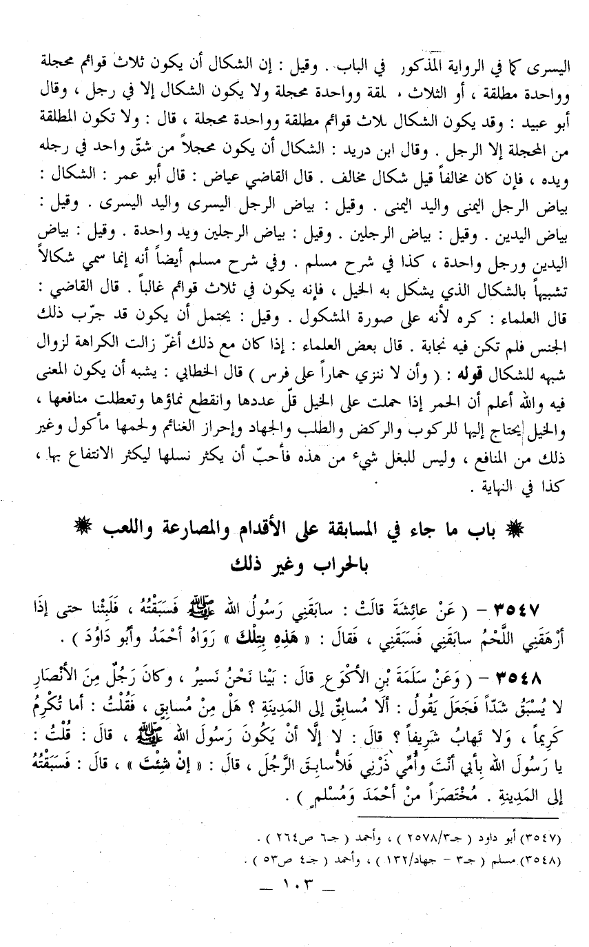 3547 - «عَنْ عَائِشَةَ قَالَتْ: سَابَقَنِي رَسُولُ اللَّه - صَلَّى اللَّهُ عَلَيْهِ وَسَلَّمَ - فَسَبَقْتُهُ، فَلَبِثْنَا حَتَّى إذَا أَرْهَقَنِي اللَّحْمُ سَابَقَنِي فَسَبَقَنِي، فَقَالَ: هَذِهِ بِتِلْكَ» رَوَاهُ أَحْمَدُ وَأَبُو دَاوُد.