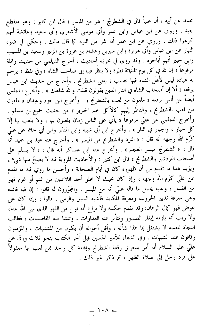ـــــــــــــــــــــــــــــQمُحَمَّدٍ عَنْ أَبِيهِ " أَنَّ عَلِيًّا قَالَ فِي الشِّطْرَنْجِ: هُوَ مِنْ الْمَيْسِرِ " قَالَ ابْنُ كَثِيرٍ: وَهُوَ مُنْقَطِعٌ جَيِّدٌ وَرُوِيَ عَنْ ابْنِ عَبَّاسٍ وَابْنِ عُمَرَ وَأَبِي مُوسَى الْأَشْعَرِيِّ وَأَبِي سَعِيدٍ وَعَائِشَةَ أَنَّهُمْ كَرِهُوا ذَلِكَ.