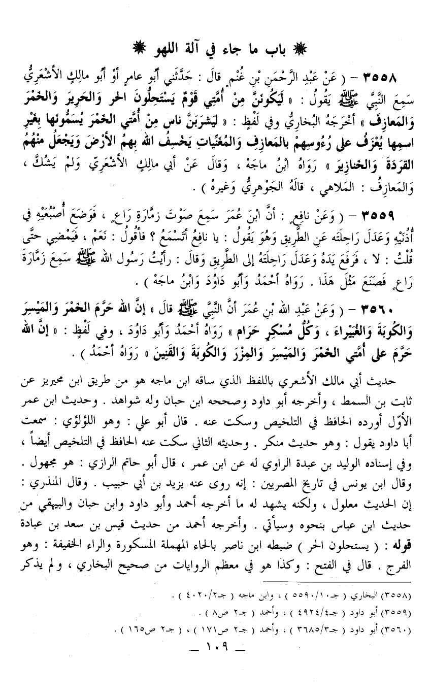 3558 - (عَنْ عَبْدِ الرَّحْمَنِ بْنِ غُنْمٍ قَالَ: حَدَّثَنِي أَبُو عَامِرٍ أَوْ أَبُو مَالِكٍ الْأَشْعَرِيُّ سَمِعَ النَّبِيَّ - صَلَّى اللَّهُ عَلَيْهِ وَسَلَّمَ - يَقُولُ: «لَيَكُونَنَّ مِنْ أُمَّتِي قَوْمٌ يَسْتَحِلُّونَ الْحِرَ وَالْحَرِيرَ وَالْخَمْرَ وَالْمَعَازِفَ» أَخْرَجَهُ الْبُخَارِيُّ وَفِي لَفْظٍ: «لَيَشْرَبَنَّ نَاسٌ مِنْ أُمَّتِي الْخَمْرَ يُسَمُّونَهَا بِغَيْرِ اسْمِهَا يُعْزَفُ عَلَى رُءُوسِهِمْ بِالْمَعَازِفِ وَالْمُغَنِّيَاتِ يَخْسِفُ اللَّهُ بِهِمْ الْأَرْضَ وَيَجْعَلُ مِنْهُمْ الْقِرَدَةَ وَالْخَنَازِيرَ» رَوَاهُ ابْنُ مَاجَهْ، وَقَالَ عَنْ أَبِي مَالِكٍ الْأَشْعَرِيِّ وَلَمْ يَشُكَّ وَالْمَعَازِفُ: الْمَلَاهِي، قَالَهُ الْجَوْهَرِيُّ وَغَيْرُهُ) .
