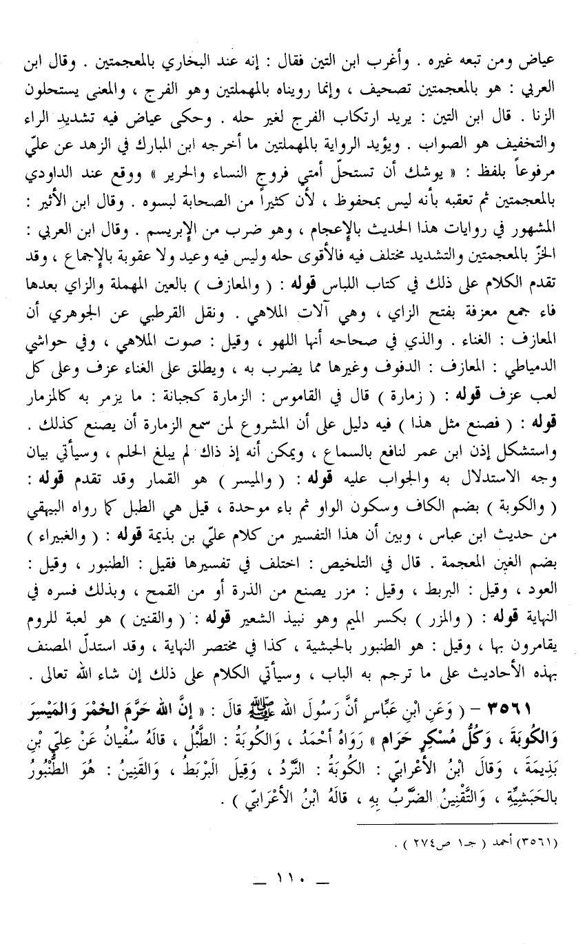 3561 - (وَعَنْ ابْنِ عَبَّاسٍ أَنَّ رَسُولَ اللَّهِ قَالَ - صَلَّى اللَّهُ عَلَيْهِ وَسَلَّمَ -: «إنَّ اللَّهَ حَرَّمَ الْخَمْرَ وَالْمَيْسِرَ وَالْكُوبَةَ، وَكُلُّ مُسْكِرٍ حَرَامٌ» رَوَاهُ أَحْمَدُ وَالْكُوبَةُ: الطَّبْلُ، قَالَهُ سُفْيَانُ عَنْ عَلِيِّ بْنِ بَذِيمَةَ، وَقَالَ ابْنُ الْأَعْرَابِيِّ: الْكُوبَةُ: النَّرْدُ، وَقِيلَ الْبَرْبَطُ، وَالْقَنِينُ: هُوَ الطُّنْبُورُ بِالْحَبَشِيَّةِ، وَالتَّقْنِينُ الضَّرْبُ بِهِ، قَالَهُ ابْنُ الْأَعْرَابِيِّ) .