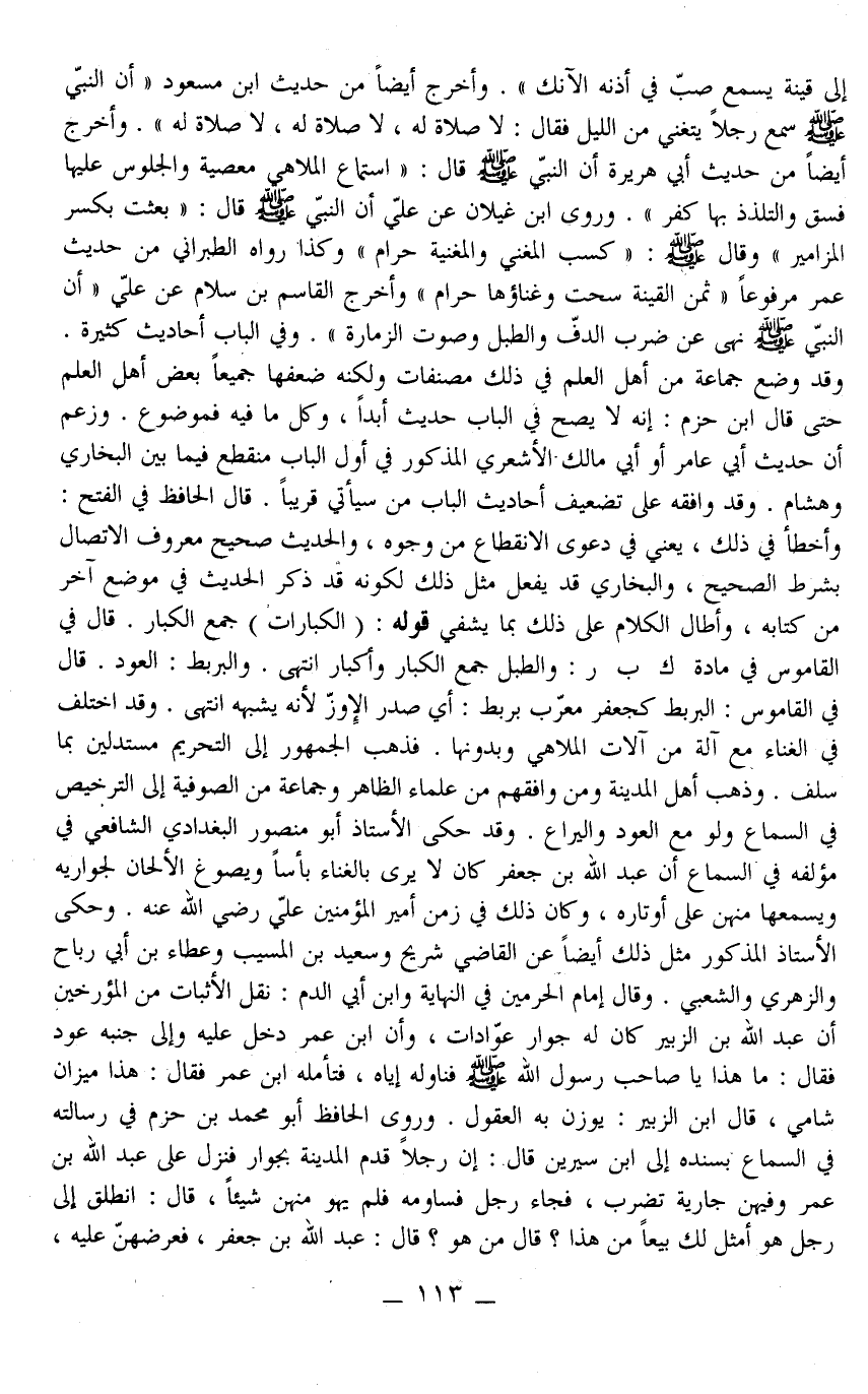 وَأَخْرَجَ أَيْضًا مِنْ حَدِيثِ أَبِي هُرَيْرَةَ أَنَّ النَّبِيَّ - صَلَّى اللَّهُ عَلَيْهِ وَسَلَّمَ - قَالَ: «اسْتِمَاعُ الْمَلَاهِي مَعْصِيَةٌ وَالْجُلُوسُ عَلَيْهَا فِسْقٌ وَالتَّلَذُّذُ بِهَا كُفْرٌ» وَرَوَى ابْنُ غِيلَانَ عَنْ عَلِيٍّ أَنَّ النَّبِيَّ - صَلَّى اللَّهُ عَلَيْهِ وَسَلَّمَ - قَالَ: «بُعِثْتُ بِكَسْرِ الْمَزَامِيرِ» وَقَالَ - صَلَّى اللَّهُ عَلَيْهِ وَسَلَّمَ -: «كَسْبُ الْمُغَنِّي وَالْمُغَنِّيَةِ حَرَامٌ» وَكَذَا رَوَاهُ الطَّبَرَانِيُّ مِنْ حَدِيثِ عُمَرَ مَرْفُوعًا «ثَمَنُ الْقَيْنَةِ سُحْتٌ وَغِنَاؤُهَا حَرَامٌ» وَأَخْرَجَ الْقَاسِمُ بْنُ سَلَّامٍ عَنْ عَلِيٍّ «أَنَّ النَّبِيَّ - صَلَّى اللَّهُ عَلَيْهِ وَسَلَّمَ - نَهَى عَنْ ضَرْبِ الدُّفِّ وَالطَّبْلِ وَصَوْتِ الزَّمَّارَةِ» .
