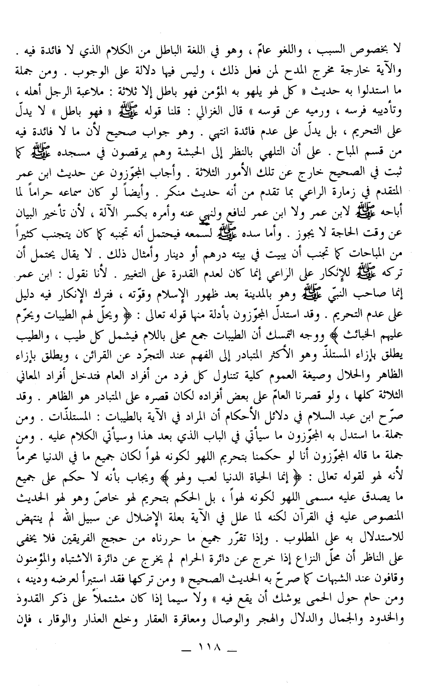وَقَدْ صَرَّحَ ابْنُ عَبْدِ السَّلَامِ فِي دَلَائِلِ الْأَحْكَامِ أَنَّ الْمُرَادَ فِي الْآيَةِ بِالطَّيِّبَاتِ: الْمُسْتَلَذَّاتُ وَمِنْ جُمْلَةِ مَا اسْتَدَلَّ بِهِ الْمُجَوِّزُونَ مَا سَيَأْتِي فِي الْبَابِ الَّذِي بَعْدَ هَذَا وَسَيَأْتِي الْكَلَامُ عَلَيْهِ. وَمِنْ جُمْلَةِ مَا قَالَهُ الْمُجَوِّزُونَ أَنَّا لَوْ حَكَمْنَا بِتَحْرِيمِ اللَّهْوِ لِكَوْنِهِ لَهْوًا لَكَانَ جَمِيعُ مَا فِي الدُّنْيَا مُحَرَّمًا لِأَنَّهُ لَهْوٌ لِقَوْلِهِ تَعَالَى: {إِنَّمَا الْحَيَاةُ الدُّنْيَا لَعِبٌ وَلَهْوٌ} [محمد: 36] وَيُجَابُ بِأَنَّهُ لَا حُكْمَ عَلَى جَمِيعِ مَا يَصْدُقُ عَلَيْهِ مُسَمَّى اللَّهْوِ لِكَوْنِهِ لَهْوًا، بَلْ الْحُكْمُ بِتَحْرِيمِ لَهْوٍ خَاصٍّ وَهُوَ لَهْوُ الْحَدِيثِ الْمَنْصُوصِ عَلَيْهِ فِي الْقُرْآنِ لَكِنَّهُ لَمَّا عَلَّلَ فِي الْآيَةِ بِعِلَّةِ الْإِضْلَالِ عَنْ سَبِيلِ اللَّهِ لَمْ يَنْتَهِضْ لِلِاسْتِدْلَالِ بِهِ عَلَى الْمَطْلُوبِ وَإِذَا تَقَرَّرَ جَمِيعُ مَا حَرَّرْنَاهُ مِنْ حُجَجِ الْفَرِيقَيْنِ، فَلَا يَخْفَى عَلَى النَّاظِرِ أَنَّ مَحَلَّ النِّزَاعِ إذَا خَرَجَ عَنْ دَائِرَةِ الْحَرَامِ لَمْ يَخْرُجْ عَنْ دَائِرَةِ الِاشْتِبَاهِ وَالْمُؤْمِنُونَ وَقَّافُونَ عِنْدَ الشُّبُهَاتِ كَمَا صَرَّحَ بِهِ الْحَدِيثُ الصَّحِيحُ «وَمَنْ تَرَكَهَا فَقَدْ اسْتَبْرَأَ لِعَرْضِهِ وَدِينِهِ، وَمَنْ حَامَ حَوْلَ الْحِمَى يُوشِكُ أَنْ يَقَعَ فِيهِ» وَلَا سِيَّمَا إذَا كَانَ مُشْتَمِلًا عَلَى ذِكْرِ الْقُدُودِ وَالْخُدُودِ وَالْجَمَالِ وَالدَّلَالِ وَالْهَجْرِ وَالْوِصَالِ وَمُعَاقَرَةِ الْعَقَارِ وَخَلْعِ الْعِذَارِ وَالْوَقَارِ، فَإِنَّ