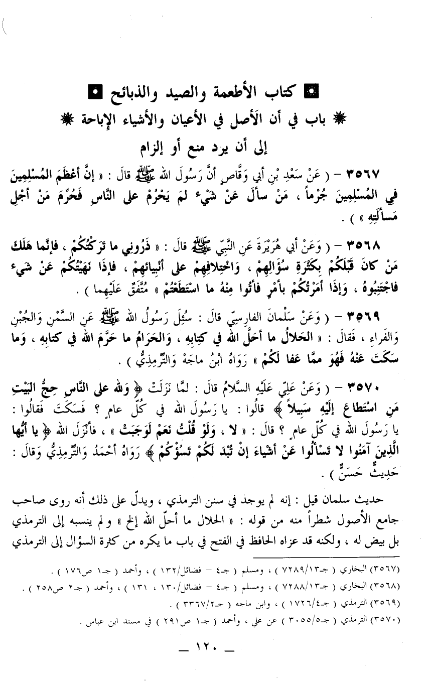 3567 - (عَنْ سَعْدِ بْنِ أَبِي وَقَّاصٍ أَنَّ رَسُولَ اللَّهِ - صَلَّى اللَّهُ عَلَيْهِ وَسَلَّمَ - قَالَ: «إنَّ أَعْظَمَ الْمُسْلِمِينَ فِي الْمُسْلِمِينَ جُرْمًا، مَنْ سَأَلَ عَنْ شَيْءٍ لَمْ يُحَرَّمْ عَلَى النَّاسِ فَحُرِّمَ مِنْ أَجْلِ مَسْأَلَتِهِ» ) .