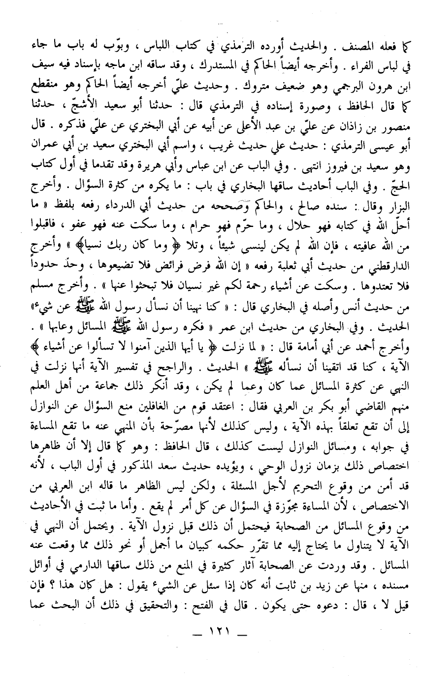 وَحَدِيثُ عَلِيٍّ أَخْرَجَهُ أَيْضًا الْحَاكِمُ وَهُوَ مُنْقَطِعٌ كَمَا قَالَ الْحَافِظُ، وَصُورَةُ إسْنَادِهِ فِي التِّرْمِذِيِّ قَالَ: حَدَّثَنَا أَبُو سَعِيدٍ الْأَشَجُّ، حَدَّثَنَا مَنْصُورُ بْنُ زَاذَانَ عَنْ عَلِيِّ بْنِ عَبْدِ الْأَعْلَى عَنْ أَبِيهِ عَنْ أَبِي الْبَخْتَرِيِّ عَنْ عَلِيٍّ فَذَكَرَهُ. قَالَ أَبُو عِيسَى التِّرْمِذِيُّ: حَدِيثُ عَلِيٍّ حَدِيثٌ غَرِيبٌ، وَاسْمُ أَبِي الْبَخْتَرِيِّ سَعِيدُ بْنُ أَبِي عِمْرَانَ وَهُوَ سَعِيدُ بْنُ فَيْرُوزَ انْتَهَى. وَفِي الْبَابِ عَنْ ابْنِ عَبَّاسٍ وَأَبِي هُرَيْرَةَ وَقَدْ تَقَدَّمَا فِي أَوَّلِ كِتَابِ الْحَجِّ. وَفِي الْبَابِ أَحَادِيثُ سَاقَهَا الْبُخَارِيُّ فِي بَابِ: مَا يُكْرَهُ مِنْ كَثْرَةِ السُّؤَالِ. وَأَخْرَجَ الْبَزَّارُ وَقَالَ: سَنَدُهُ صَالِحٌ، وَالْحَاكِمُ وَصَحَّحَهُ مِنْ حَدِيثِ أَبِي الدَّرْدَاءِ رَفَعَهُ بِلَفْظِ «مَا أَحَلَّ اللَّهُ فِي كِتَابِهِ فَهُوَ حَلَالٌ، وَمَا حَرَّمَ فَهُوَ حَرَامٌ، وَمَا سَكَتَ عَنْهُ فَهُوَ عَفْوٌ، فَاقْبَلُوا مِنْ اللَّهِ عَافِيَتَهُ، فَإِنَّ اللَّهَ لَمْ يَكُنْ لِيَنْسَى شَيْئًا، وَتَلَا {وَمَا كَانَ رَبُّكَ نَسِيًّا} [مريم: 64] » .