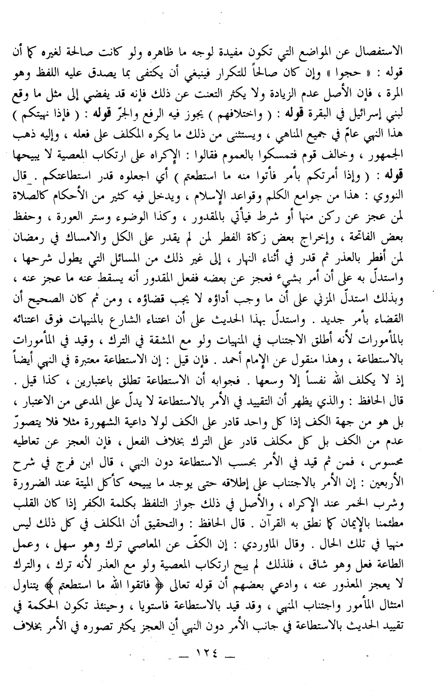 قَالَ الْحَافِظُ: وَالتَّحْقِيقُ أَنَّ الْمُكَلَّفَ فِي كُلِّ ذَلِكَ لَيْسَ مَنْهِيًّا فِي تِلْكَ الْحَالِ. وَقَالَ الْمَاوَرْدِيُّ: إنَّ الْكَفَّ عَنْ الْمَعَاصِي تَرْكٌ وَهُوَ سَهْلٌ، وَعَمَلُ الطَّاعَةِ فِعْلٌ وَهُوَ شَاقٌّ، فَلِذَلِكَ لَمْ يُبِحْ ارْتِكَابَ الْمَعْصِيَةِ وَلَوْ مَعَ الْعُذْرِ لِأَنَّهُ تَرْكٌ، وَالتَّرْكُ لَا يَعْجَزُ الْمَعْذُورُ عَنْهُ، وَادَّعَى بَعْضُهُمْ أَنَّ قَوْله تَعَالَى {فَاتَّقُوا اللَّهَ مَا اسْتَطَعْتُمْ} [التغابن: 16] يَتَنَاوَلُ امْتِثَالَ الْمَأْمُورِ وَاجْتِنَابَ الْمَنْهِيِّ، وَقَدْ قُيِّدَ بِالِاسْتِطَاعَةِ فَاسْتَوَيَا، وَحِينَئِذٍ تَكُونُ الْحِكْمَةُ فِي تَقْيِيدِ الْحَدِيثِ بِالِاسْتِطَاعَةِ فِي جَانِبِ الْأَمْرِ دُونَ النَّهْيِ أَنَّ الْعَجْزَ يَكْثُرُ تَصَوُّرُهُ فِي الْأَمْرِ بِخِلَافِ