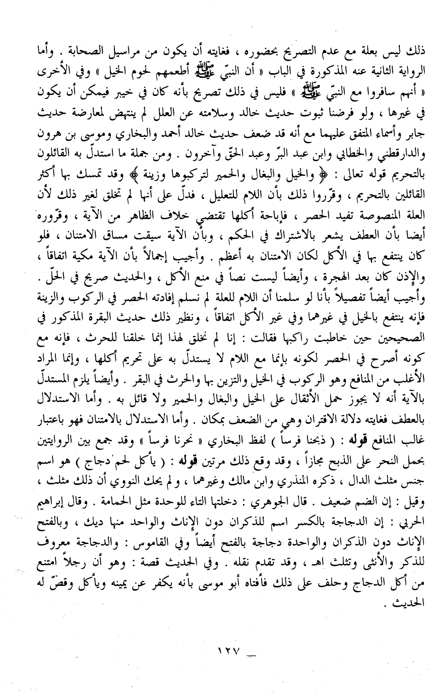 وَأُجِيبَ أَيْضًا تَفْصِيلًا بِأَنَّا لَوْ سَلَّمْنَا أَنَّ اللَّامَ لِلْعِلَّةِ لَمْ نُسَلِّمْ إفَادَتَهُ الْحَصْرَ فِي الرُّكُوبِ وَالزِّينَةِ فَإِنَّهُ يَنْتَفِعُ بِالْخَيْلِ فِي غَيْرِهِمَا وَفِي غَيْرِ الْأَكْلِ اتِّفَاقًا، وَنَظِيرُ ذَلِكَ حَدِيثُ الْبَقَرَةِ الْمَذْكُورِ فِي الصَّحِيحَيْنِ حِينَ خَاطَبَتْ رَاكِبَهَا فَقَالَتْ: إنَّا لَمْ نُخْلَقْ لِهَذَا إنَّمَا خُلِقْنَا لِلْحَرْثِ، فَإِنَّهُ مَعَ كَوْنِهِ أَصَرْحَ فِي الْحَصْرِ لِكَوْنِهِ بِإِنَّمَا مَعَ اللَّامِ لَا يُسْتَدَلُّ بِهِ عَلَى تَحْرِيمِ أَكْلِهَا، وَإِنَّمَا الْمُرَادُ الْأَغْلَبُ مِنْ الْمَنَافِعِ وَهُوَ الرُّكُوبُ فِي الْخَيْلِ وَالتَّزَيُّنُ بِهَا وَالْحَرْثُ فِي الْبَقَرِ. وَأَيْضًا يَلْزَمُ الْمُسْتَدِلَّ بِالْآيَةِ أَنَّهُ لَا يَجُوزُ حَمْلُ الْأَثْقَالِ عَلَى الْخَيْلِ وَالْبِغَالِ وَالْحَمِيرِ وَلَا قَائِلَ بِهِ. وَأَمَّا الِاسْتِدْلَال بِالْعَطْفِ فَغَايَتُهُ دَلَالَةُ الِاقْتِرَانِ وَهِيَ مِنْ الضَّعْفِ بِمَكَانٍ. وَأَمَّا الِاسْتِدْلَال بِالِامْتِنَانِ فَهُوَ بِاعْتِبَارِ غَالِبِ الْمَنَافِعِ. قَوْلُهُ: (ذَبَحْنَا فَرَسًا) لَفْظُ الْبُخَارِيِّ " نَحَرْنَا فَرَسًا " وَقَدْ جُمِعَ بَيْنَ الرِّوَايَتَيْنِ بِحَمْلِ النَّحْرِ عَلَى الذَّبْحِ مَجَازًا، وَقَدْ وَقَعَ ذَلِكَ مَرَّتَيْنِ قَوْلُهُ: (يَأْكُلُ لَحْمَ دَجَاجٍ) هُوَ اسْمُ جِنْسٍ مُثَلَّثِ الدَّالِ، ذَكَرَهُ الْمُنْذِرِيُّ وَابْنُ مَالِكٍ وَغَيْرُهُمَا، وَلَمْ يَحْكِ النَّوَوِيُّ أَنَّ ذَلِكَ مُثَلَّثٌ، وَقِيلَ: إنَّ الضَّمَّ ضَعِيفٌ. قَالَ الْجَوْهَرِيُّ: دَخَلَتْهَا التَّاءُ لِلْوَحْدَةِ مِثْلُ الْحَمَامَةِ. وَقَالَ إبْرَاهِيمُ الْحَرْبِيُّ: إنَّ الدَّجَاجَةَ بِالْكَسْرِ اسْمٌ لِلذُّكْرَانِ دُونَ الْإِنَاثِ وَالْوَاحِدُ مِنْهَا دِيكٌ، وَبِالْفَتْحِ الْإِنَاثُ دُونَ الذُّكْرَانِ وَالْوَاحِدَةُ دَجَاجَةٌ بِالْفَتْحِ أَيْضًا وَفِي الْقَامُوسِ: وَالدَّجَاجَةُ مَعْرُوفٌ لِلذَّكَرِ وَالْأُنْثَى وَتُثَلَّثُ اهـ، وَقَدْ تَقَدَّمَ نَقْلُهُ.