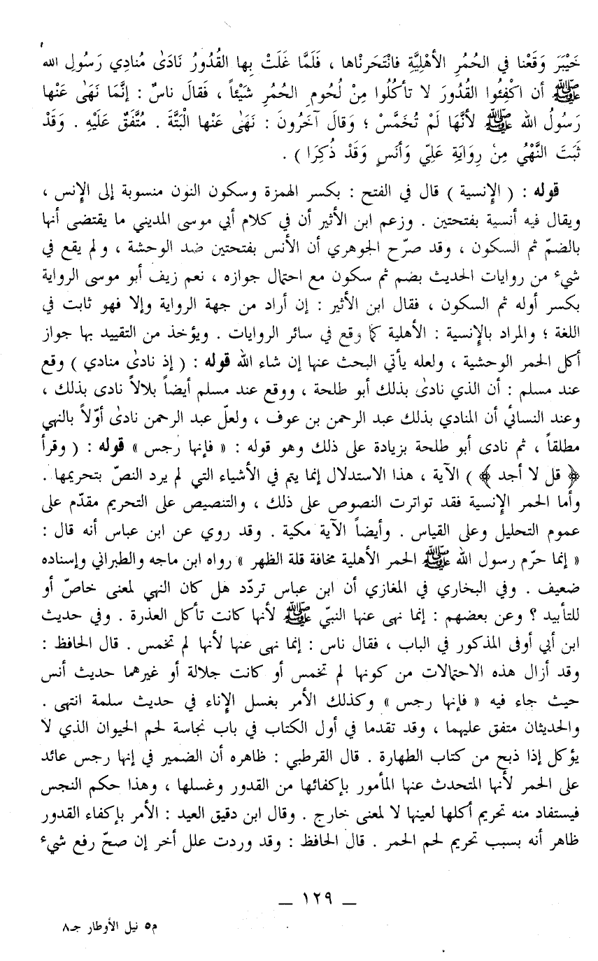وَفِي حَدِيثِ ابْنِ أَبِي أَوْفَى الْمَذْكُورِ فِي الْبَابِ، فَقَالَ نَاسٌ: إنَّمَا نَهَى عَنْهَا لِأَنَّهَا لَمْ تُخَمَّسْ. قَالَ الْحَافِظُ: وَقَدْ أَزَالَ هَذِهِ الِاحْتِمَالَاتِ مِنْ كَوْنِهَا لَمْ تُخَمَّسْ أَوْ كَانَتْ جَلَّالَةً أَوْ غَيْرَهُمَا حَدِيثُ أَنَسٍ حَيْثُ جَاءَ فِيهِ " فَإِنَّهَا رِجْسٌ " وَكَذَلِكَ الْأَمْرُ بِغَسْلِ الْإِنَاءِ فِي حَدِيثِ سَلَمَةَ انْتَهَى. وَالْحَدِيثَانِ مُتَّفَقٌ عَلَيْهِمَا، وَقَدْ تَقَدَّمَا فِي أَوَّلِ الْكِتَابِ فِي بَابِ نَجَاسَةِ لَحْمِ الْحَيَوَانِ الَّذِي لَا يُؤْكَلُ إذَا ذُبِحَ مِنْ كِتَابِ الطَّهَارَةِ. قَالَ الْقُرْطُبِيُّ: ظَاهِرُهُ أَنَّ الضَّمِيرَ فِي إنَّهَا رِجْسٌ عَائِدٌ عَلَى الْحُمُرِ لِأَنَّهَا الْمُتَحَدَّثُ عَنْهَا الْمَأْمُورُ بِإِكْفَائِهَا مِنْ الْقُدُورِ وَغَسْلِهَا، وَهَذَا حُكْمُ النَّجَسِ فَيُسْتَفَادُ مِنْهُ تَحْرِيمُ أَكْلِهَا لِعَيْنِهَا لَا لِمَعْنًى خَارِجٍ. وَقَالَ ابْنُ دَقِيقِ الْعِيدِ: الْأَمْرُ بِإِكْفَاءِ الْقُدُورِ ظَاهِرُ أَنَّهُ بِسَبَبِ تَحْرِيمِ لَحْمِ الْحُمُرِ. قَالَ الْحَافِظُ: وَقَدْ وَرَدَتْ عِلَلٌ أُخَرُ إنْ صَحَّ رَفْعُ شَيْءٍ