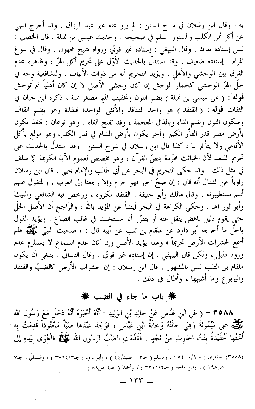 3588 - (عَنْ ابْنِ عَبَّاسٍ عَنْ خَالِدِ بْنِ الْوَلِيدِ أَنَّهُ أَخْبَرَهُ أَنَّهُ «دَخَلَ مَعَ رَسُولِ اللَّهِ - صَلَّى اللَّهُ عَلَيْهِ وَسَلَّمَ - عَلَى مَيْمُونَةَ وَهِيَ خَالَتُهُ وَخَالَةُ ابْنِ عَبَّاسٍ، فَوَجَدَ عِنْدَهَا ضَبًّا مَحْنُوذًا قَدِمَتْ بِهِ أُخْتُهَا حُفَيْدَةُ بِنْتُ الْحَارِثِ مِنْ نَجْدٍ، فَقَدَّمَتْ الضَّبَّ لِرَسُولِ اللَّهِ - صَلَّى اللَّهُ عَلَيْهِ وَسَلَّمَ - فَأَهْوَى بِيَدِهِ إلَى
