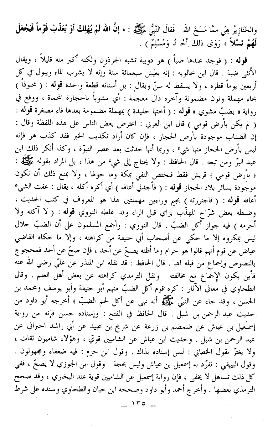 قَوْلُهُ: (مَحْنُوذًا) بِحَاءٍ مُهْمَلَةٍ وَنُونٍ مَضْمُومَةٍ وَآخِرُهُ ذَالٌ مُعْجَمَةٌ: أَيْ مَشْوِيًّا بِالْحِجَارَةِ الْمُحْمَاةِ، وَوَقَعَ فِي رِوَايَةٍ " بِضَبٍّ مَشْوِيٍّ ". قَوْلُهُ: (أُخْتُهَا حُفَيْدَةُ) بِمُهْمَلَةٍ مَضْمُومَةٍ بَعْدَهَا فَاءٌ مُصَغَّرَةٌ قَوْلُهُ: (لَمْ يَكُنْ بِأَرْضِ قَوْمِي) قَالَ ابْنُ الْعَرَبِيِّ: اعْتَرَضَ بَعْضُ النَّاسِ عَلَى هَذِهِ اللَّفْظَةِ وَقَالَ: إنَّ الضِّبَابَ مَوْجُودَةٌ بِأَرْضِ الْحِجَازِ، فَإِنْ كَانَ أَرَادَ تَكْذِيبَ الْخَبَرِ فَقَدْ كَذَبَ هُوَ فَإِنَّهُ لَيْسَ بِأَرْضِ الْحِجَازِ مِنْهَا شَيْءٌ، وَرُبَّمَا أَنَّهَا حَدَثَتْ بَعْدَ عَصْرِ النُّبُوَّةِ، وَكَذَا أَنْكَرَ ذَلِكَ ابْنُ عَبْدِ الْبَرِّ وَمَنْ تَبِعَهُ. قَالَ الْحَافِظُ: وَلَا يَحْتَاجُ إلَى شَيْءٍ مِنْ هَذَا، بَلْ الْمُرَادُ بِقَوْلِهِ: - صَلَّى اللَّهُ عَلَيْهِ وَسَلَّمَ - " بِأَرْضِ قَوْمِي قُرَيْشٌ فَقَطْ فَيَخْتَصُّ النَّفْيُ بِمَكَّةَ وَمَا حَوْلَهَا، وَلَا يَمْنَعُ ذَلِكَ أَنْ تَكُونَ مَوْجُودَةً بِسَائِرِ بِلَادِ الْحِجَازِ. قَوْلُهُ: (فَأَجِدُنِي أَعَافُهُ) أَيْ أَكْرَهُ أَكْلَهُ، يُقَالُ: عِفْتُ الشَّيْءَ أَعَافُهُ. قَوْلُهُ: (فَاجْتَرَرْتُهُ) بِجِيمٍ وَرَاءَيْنِ مُهْمَلَتَيْنِ هَذَا هُوَ الْمَعْرُوفُ فِي كُتُبِ الْحَدِيثِ، وَضَبَطَهُ بَعْضُ شُرَّاحِ الْمُهَذَّبِ بِزَايٍ قَبْلَ الرَّاءِ وَقَدْ غَلَّطَهُ النَّوَوِيُّ.