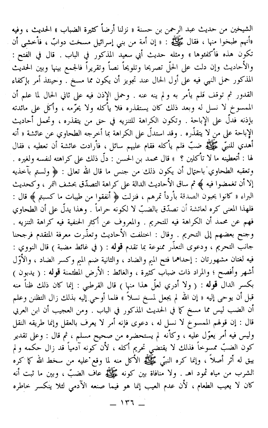 وَتَعَقَّبَهُ الطَّحَاوِيُّ بِاحْتِمَالِ أَنْ يَكُونَ ذَلِكَ مِنْ جِنْسِ مَا قَالَ اللَّهُ تَعَالَى: {وَلَسْتُمْ بِآخِذِيهِ إِلا أَنْ تُغْمِضُوا فِيهِ} [البقرة: 267] ثُمَّ سَاقَ الْأَحَادِيثَ الدَّالَّةَ عَلَى كَرَاهَةِ التَّصَدُّقِ بِحَشَفِ التَّمْرِ، وَكَحَدِيثِ الْبَرَاءِ «كَانُوا يُحِبُّونَ الصَّدَقَةَ بِأَرْدَإِ تَمْرِهِمْ، فَنَزَلَتْ {أَنْفِقُوا مِنْ طَيِّبَاتِ مَا كَسَبْتُمْ} [البقرة: 267] » قَالَ: فَلِهَذَا الْمَعْنَى كَرِهَ لِعَائِشَةَ أَنْ تَصَدَّقَ بِالضَّبِّ لَا لِكَوْنِهِ حَرَامًا. وَهَذَا يَدُلُّ عَلَى أَنَّ الطَّحَاوِيَّ فَهِمَ عَنْ مُحَمَّدٍ أَنَّ الْكَرَاهَةَ فِيهِ لِلتَّحْرِيمِ. وَالْمَعْرُوفُ عَنْ أَكْثَرِ الْحَنَفِيَّةِ فِيهِ كَرَاهَةُ التَّنْزِيهِ. وَجَنَحَ بَعْضُهُمْ إلَى التَّحْرِيمِ. وَقَالَ: اخْتَلَفَتْ الْأَحَادِيثُ وَتَعَذَّرَتْ مَعْرِفَةُ الْمُتَقَدِّمِ فَرَجَّحْنَا جَانِبَ التَّحْرِيمِ، وَدَعْوَى التَّعَذُّرِ مَمْنُوعَةٌ بِمَا تَقَدَّمَ قَوْلُهُ: (فِي غَائِطٍ مُضَبَّةٍ) قَالَ النَّوَوِيُّ: فِيهِ لُغَتَانِ مَشْهُورَتَانِ: إحْدَاهُمَا فَتْحُ الْمِيمِ وَالضَّادِ، وَالثَّانِيَةُ ضَمُّ الْمِيمِ وَكَسْرُ الضَّادِ، وَالْأَوَّلُ أَشْهَرُ وَأَفْصَحُ، وَالْمُرَادُ ذَاتُ ضِبَابٍ كَثِيرَةٍ، وَالْغَائِطُ: الْأَرْضُ الْمُطَيَّنَةُ. قَوْلُهُ: (يَدِبُّونَ) بِكَسْرِ الدَّالِ.