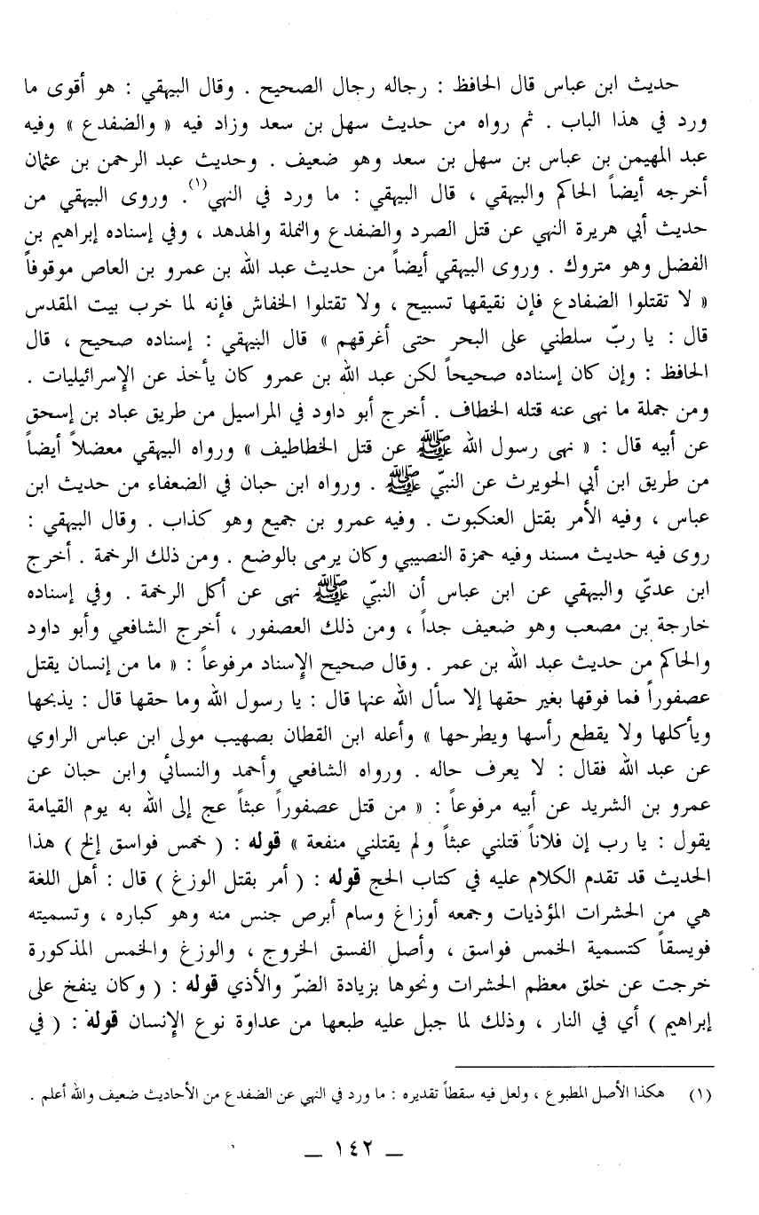 حَدِيثُ ابْنِ عَبَّاسٍ قَالَ الْحَافِظُ: رِجَالُهُ رِجَالُ الصَّحِيحِ. وَقَالَ الْبَيْهَقِيُّ: هُوَ أَقْوَى مَا وَرَدَ فِي هَذَا الْبَابِ. ثُمَّ رَوَاهُ مِنْ حَدِيثِ سَهْلِ بْنِ سَعْدٍ وَزَادَ فِيهِ " وَالضُّفْدَعَ " وَفِيهِ عَبْدُ الْمُهَيْمِنِ بْنُ عَبَّاسِ بْنِ سَهْلِ بْنِ سَعْدٍ وَهُوَ ضَعِيفٌ.