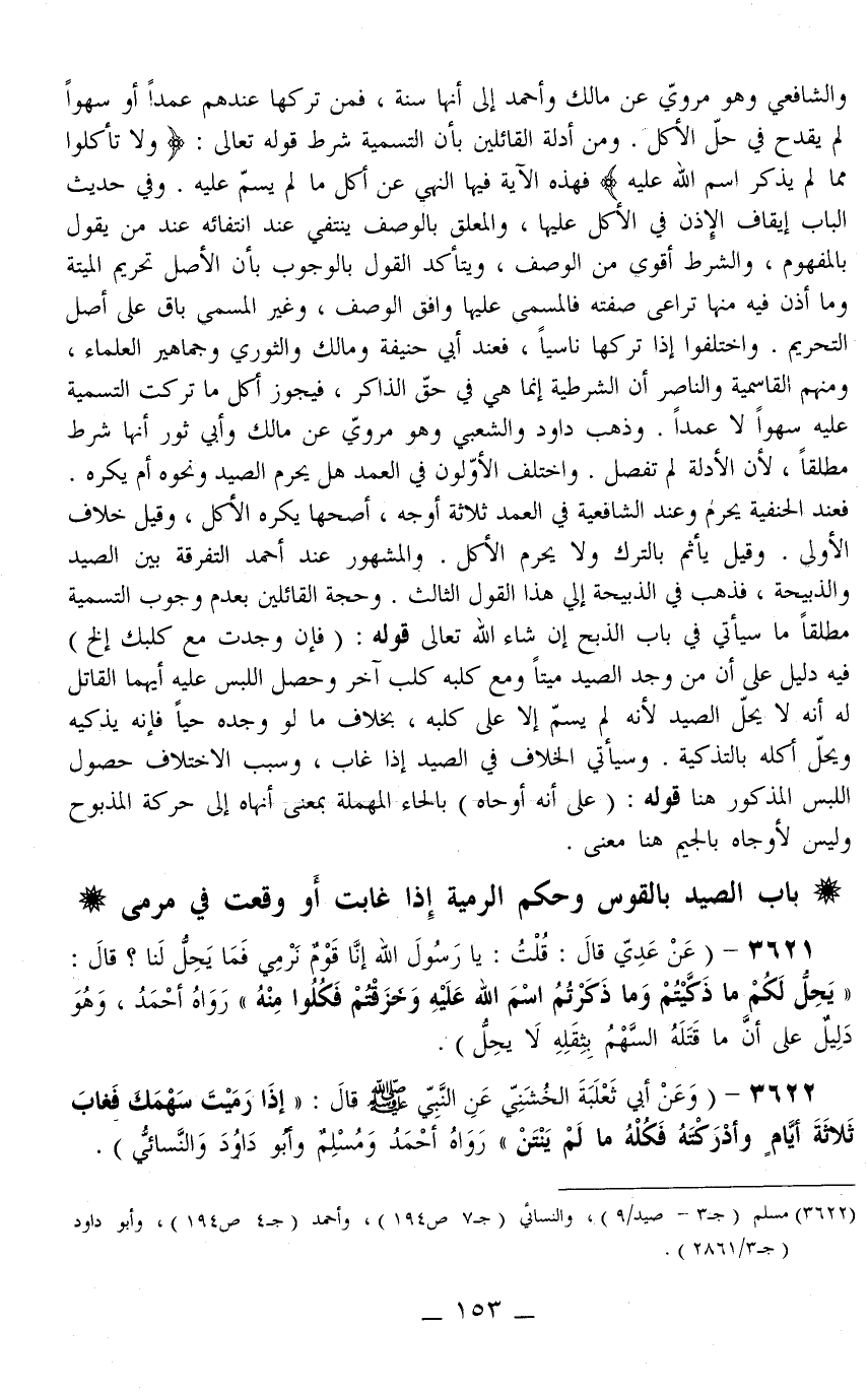 3621 - (عَنْ عَدِيٍّ قَالَ: «قُلْتُ: يَا رَسُولَ اللَّهِ إنَّا قَوْمٌ نَرْمِي فَمَا يَحِلُّ لَنَا؟ قَالَ: يَحِلُّ لَكُمْ مَا ذَكَّيْتُمْ وَمَا ذَكَرْتُمْ اسْمَ اللَّهِ عَلَيْهِ وَخَزَقْتُمْ فَكُلُوا مِنْهُ» رَوَاهُ أَحْمَدُ وَهُوَ دَلِيلٌ عَلَى أَنَّ مَا قَتَلَهُ السَّهْمُ بِثِقَلِهِ لَا يَحِلُّ) .