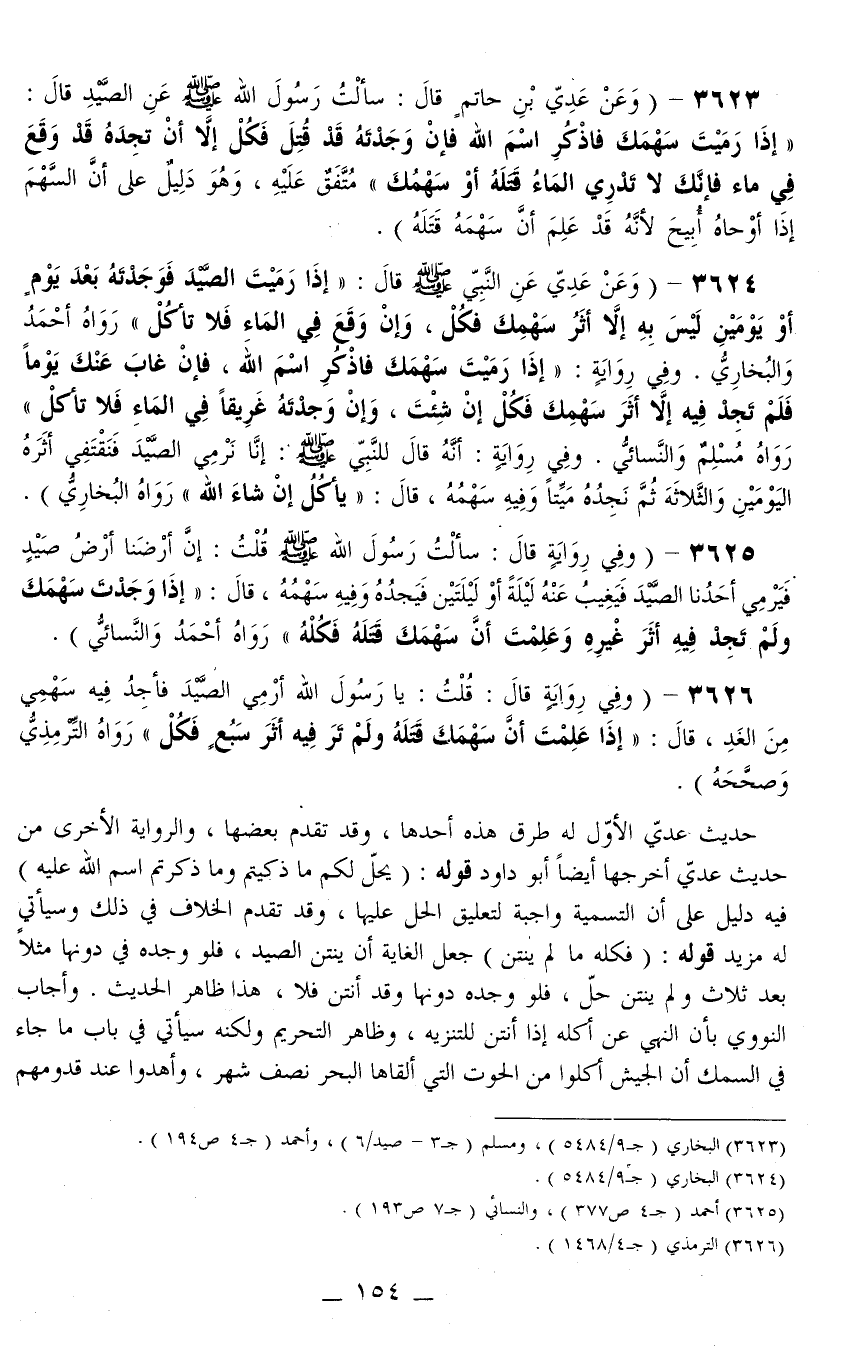 3624 - (وَعَنْ عَدِيٍّ عَنْ النَّبِيِّ - صَلَّى اللَّهُ عَلَيْهِ وَسَلَّمَ - قَالَ: «إذَا رَمَيْتَ الصَّيْدَ فَوَجَدْتَهُ بَعْدَ يَوْمٍ أَوْ يَوْمَيْنِ لَيْسَ بِهِ إلَّا أَثَرُ سَهْمِكَ فَكُلْ، وَإِنْ وَقَعَ فِي الْمَاءِ فَلَا تَأْكُلْ» رَوَاهُ أَحْمَدُ وَالْبُخَارِيُّ.