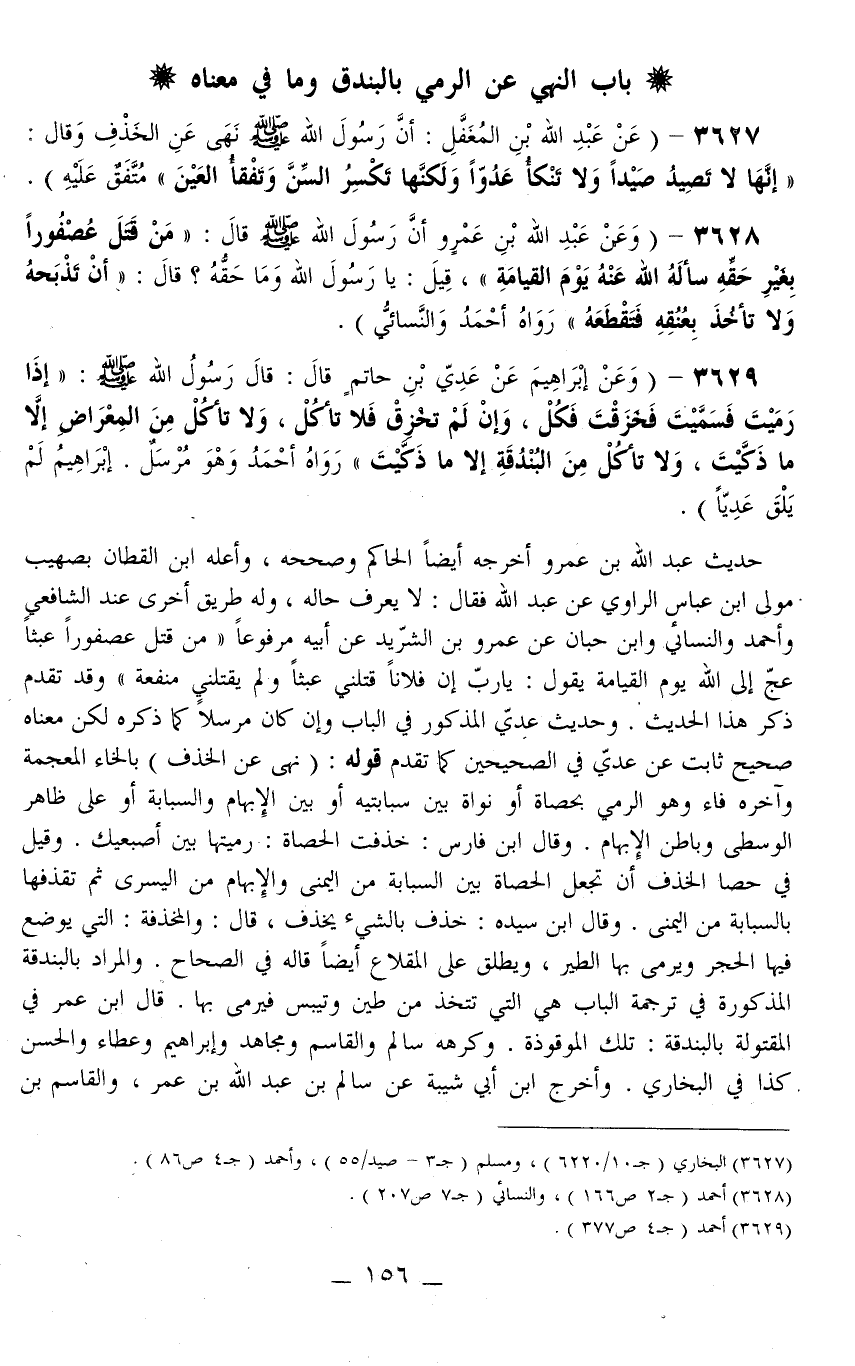 حَدِيثُ عَبْدِ اللَّهِ بْنِ عَمْرٍو أَخْرَجَهُ أَيْضًا الْحَاكِمُ وَصَحَّحَهُ، وَأَعَلَّهُ ابْنُ الْقَطَّانِ بِصُهَيْبٍ مَوْلَى ابْنِ عَبَّاسٍ الرَّاوِي عَنْ عَبْدِ اللَّهِ فَقَالَ: لَا يُعْرَفُ حَالُهُ، وَلَهُ طَرِيقٌ أُخْرَى عِنْدَ الشَّافِعِيِّ وَأَحْمَدَ وَالنَّسَائِيُّ وَابْنُ حِبَّانَ عَنْ عَمْرِو بْنِ الشَّرِيدِ عَنْ أَبِيهِ مَرْفُوعًا «مَنْ قَتَلَ عُصْفُورًا عَبَثًا عَجَّ إلَى اللَّهِ يَوْمَ الْقِيَامَةِ يَقُولُ: يَا رَبِّ إنَّ فُلَانًا قَتَلَنِي عَبَثًا وَلَمْ يَقْتُلْنِي مَنْفَعَةً» وَقَدْ تَقَدَّمَ ذِكْرُ هَذَا الْحَدِيثِ. وَحَدِيثُ عَدِيٍّ الْمَذْكُورُ فِي الْبَابِ وَإِنْ كَانَ مُرْسَلًا كَمَا ذَكَرَهُ لَكِنَّ مَعْنَاهُ صَحِيحٌ ثَابِتٌ عَنْ عَدِيٍّ فِي الصَّحِيحَيْنِ كَمَا تَقَدَّمَ. قَوْلُهُ: (نَهَى عَنْ الْخَذْفِ) بِالْخَاءِ الْمُعْجَمَةِ وَآخِرُهُ فَاءٌ وَهُوَ الرَّمْيُ بِحَصَاةٍ أَوْ نَوَاةٍ بَيْنَ سَبَّابَتَيْهِ أَوْ بَيْنَ الْإِبْهَامِ وَالسَّبَّابَةِ أَوْ عَلَى ظَاهِرِ الْوُسْطَى وَبَاطِنِ الْإِبْهَامِ. وَقَالَ ابْنُ فَارِسٍ: خَذَفْتُ الْحَصَاةَ: رَمَيْتُهَا بَيْنَ أُصْبُعَيْكَ. وَقِيلَ فِي حَصَا الْخَذْفِ أَنْ تَجْعَلَ الْحَصَاةَ بَيْنَ السَّبَّابَةِ مِنْ الْيُمْنَى وَالْإِبْهَامِ مِنْ الْيُسْرَى ثُمَّ تَقْذِفُهَا بِالسَّبَّابَةِ مِنْ الْيُمْنَى. وَقَالَ ابْنُ سِيدَهْ: خَذَفَ بِالشَّيْءِ يَخْذِفُ، قَالَ: وَالْمِخْذَفَةُ: الَّتِي يُوضَعُ فِيهَا الْحَجَرُ وَيُرْمَى بِهَا الطَّيْرُ، وَيُطْلَقُ عَلَى الْمِقْلَاعِ أَيْضًا قَالَهُ فِي الصِّحَاحِ.