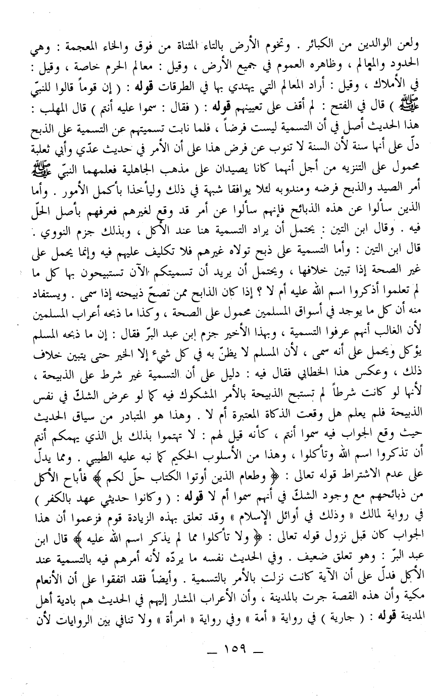 ـــــــــــــــــــــــــــــQوَلَعْنُ الْوَالِدَيْنِ مِنْ الْكَبَائِرِ. وَتُخُومُ الْأَرْضِ بِالتَّاءِ الْمُثَنَّاةِ مِنْ فَوْقُ وَالْخَاءِ الْمُعْجَمَةِ: وَهِيَ الْحُدُودُ وَالْمَعَالِمُ، وَظَاهِرُهُ الْعُمُومُ فِي جَمِيعِ الْأَرْضِ، وَقِيلَ: مَعَالِمُ الْحَرَمِ خَاصَّةً، وَقِيلَ: فِي الْأَمْلَاكِ، وَقِيلَ: أَرَادَ الْمَعَالِمَ الَّتِي يُهْتَدَى بِهَا فِي الطُّرُقَاتِ. قَوْلُهُ: (إنَّ قَوْمًا قَالُوا لِلنَّبِيِّ - صَلَّى اللَّهُ عَلَيْهِ وَسَلَّمَ -) قَالَ فِي الْفَتْحِ: لَمْ أَقِفْ عَلَى تَعْيِينِهِمْ. قَوْلُهُ: (فَقَالَ: سَمُّوا عَلَيْهِ أَنْتُمْ) قَالَ الْمُهَلَّبُ: هَذَا الْحَدِيثُ أَصْلٌ فِي أَنَّ التَّسْمِيَةَ لَيْسَتْ فَرْضًا، فَلَمَّا نَابَتْ تَسْمِيَتُهُمْ عَنْ التَّسْمِيَةِ عَلَى الذَّبْحِ دَلَّ عَلَى أَنَّهَا سُنَّةٌ لِأَنَّ السُّنَّةَ لَا تَنُوبُ عَنْ فَرْضٍ هَذَا عَلَى أَنَّ الْأَمْرَ فِي حَدِيثِ عَدِيٍّ وَأَبِي ثَعْلَبَةَ مَحْمُولٌ عَلَى التَّنْزِيهِ مِنْ أَجْلِ أَنَّهُمَا كَانَا يَصِيدَانِ عَلَى مَذْهَبِ الْجَاهِلِيَّةِ فَعَلَّمَهُمَا النَّبِيُّ - صَلَّى اللَّهُ عَلَيْهِ وَسَلَّمَ - أَمْرَ الصَّيْدِ وَالذَّبْحِ فَرْضَهُ وَمَنْدُوبَهُ لِئَلَّا يُوَافِقَا شُبْهَةً فِي ذَلِكَ وَلِيَأْخُذَا بِأَكْمَلِ الْأُمُورِ.