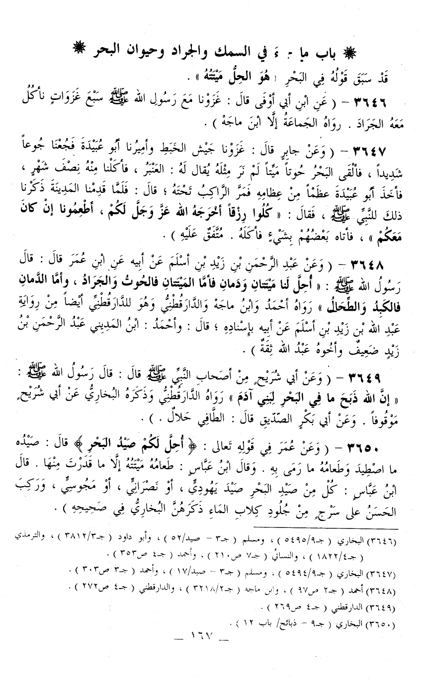 3646 - (عَنْ ابْنِ أَبِي أَوْفَى قَالَ: «غَزَوْنَا مَعَ رَسُولِ اللَّهِ - صَلَّى اللَّهُ عَلَيْهِ وَسَلَّمَ - سَبْعَ غَزَوَاتٍ نَأْكُلُ مَعَهُ الْجَرَادَ» . رَوَاهُ الْجَمَاعَةُ إلَّا ابْنَ مَاجَهْ) .