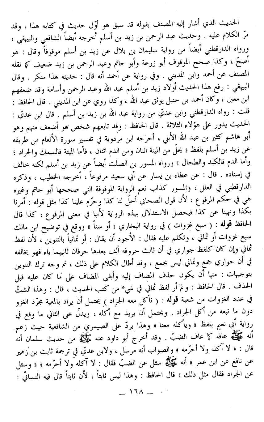 وَفِي رِوَايَةٍ عَنْ أَحْمَدَ أَنَّهُ قَالَ: حَدِيثُهُ هَذَا مُنْكَرٌ. وَقَالَ الْبَيْهَقِيُّ: رَفَعَ هَذَا الْحَدِيثَ أَوْلَادُ زَيْدِ بْنِ أَسْلَمَ عَبْدُ اللَّهِ وَعَبْدُ الرَّحْمَنِ وَأُسَامَةُ وَقَدْ ضَعَّفَهُمْ ابْنُ مَعِينٍ، وَكَانَ أَحْمَدُ بْنُ حَنْبَلٍ يُوَثِّقُ عَبْدَ اللَّهِ، وَكَذَا رُوِيَ عَنْ ابْنِ الْمَدِينِيِّ. قَالَ الْحَافِظُ: قُلْت: رَوَاهُ الدَّارَقُطْنِيّ وَابْنُ عَدِيٍّ مِنْ رِوَايَةِ عَبْدِ اللَّهِ بْنِ زَيْدِ بْنِ أَسْلَمَ. قَالَ ابْنُ عَدِيٍّ: الْحَدِيثُ يَدُورُ عَلَى هَؤُلَاءِ الثَّلَاثَةِ. قَالَ الْحَافِظُ: وَقَدْ تَابَعَهُمْ شَخْصٌ هُوَ أَضْعَفُ مِنْهُمْ وَهُوَ أَبُو هَاشِمٍ كَثِيرُ بْنُ عَبْدِ اللَّهِ الْأُبُلِّيُّ، أَخْرَجَهُ ابْنُ مَرْدُوَيْهِ فِي تَفْسِيرِ سُورَةِ الْأَنْعَامِ مِنْ طَرِيقِهِ عَنْ زَيْدِ بْنِ أَسْلَمَ بِلَفْظِ «يَحِلُّ مِنْ الْمَيْتَةِ اثْنَانِ وَمِنْ الدَّمِ اثْنَانِ، فَأَمَّا الْمَيْتَةُ فَالسَّمَكُ وَالْجَرَادُ، وَأَمَّا الدَّمُ فَالْكَبِدُ وَالطِّحَالُ» وَرَوَاهُ الْمِسْوَرُ بْنُ الصَّلْتِ أَيْضًا عَنْ زَيْدِ بْنِ أَسْلَمَ لَكِنَّهُ خَالَفَ فِي إسْنَادِهِ. قَالَ: عَنْ عَطَاءِ بْنِ يَسَارٍ عَنْ أَبِي سَعِيدٍ مَرْفُوعًا، أَخْرَجَهُ الْخَطِيبُ، وَذَكَرَهُ الدَّارَقُطْنِيّ فِي الْعِلَلِ، وَالْمِسْوَرُ كَذَّابٌ، نَعَمْ الرِّوَايَةُ الْمَوْقُوفَةُ الَّتِي صَحَّحَهَا أَبُو حَاتِمٍ وَغَيْرُهُ هِيَ فِي حُكْمِ الْمَرْفُوعِ؛ لِأَنَّ قَوْلَ الصَّحَابِيِّ أُحِلَّ لَنَا كَذَا وَحُرِّمَ عَلَيْنَا كَذَا مِثْلَ قَوْلُهُ: أُمِرْنَا بِكَذَا وَنُهِينَا عَنْ كَذَا فَيَحْصُلُ الِاسْتِدْلَال بِهَذِهِ الرِّوَايَةِ لِأَنَّهَا فِي مَعْنَى الْمَرْفُوعِ، كَذَا قَالَ الْحَافِظُ. قَوْلُهُ: (سَبْعَ غَزَوَاتٍ) فِي رِوَايَةِ الْبُخَارِيِّ " أَوْ سِتًّا " وَوَقَعَ فِي تَوْضِيحِ ابْنِ مَالِكٍ سَبْعَ غَزَوَاتٍ أَوْ ثَمَانِي، وَتَكَلَّمَ عَلَيْهِ فَقَالَ: الْأَجْوَدُ أَنْ يُقَالَ: أَوْ ثَمَانِيًا بِالتَّنْوِينِ؛ لِأَنَّ لَفْظَ ثَمَانِي وَإِنْ كَانَ كَلَفْظِ جِوَارِي فِي أَنَّ ثَالِثَ حُرُوفِهِ أَلْفٌ بَعْدَهَا حَرْفَانِ ثَانِيهِمَا يَاءٌ فَهُوَ يُخَالِفُهُ فِي أَنَّ جِوَارِي جَمْعٌ وَثَمَانِيَ لَيْسَ بِجَمْعِ.
