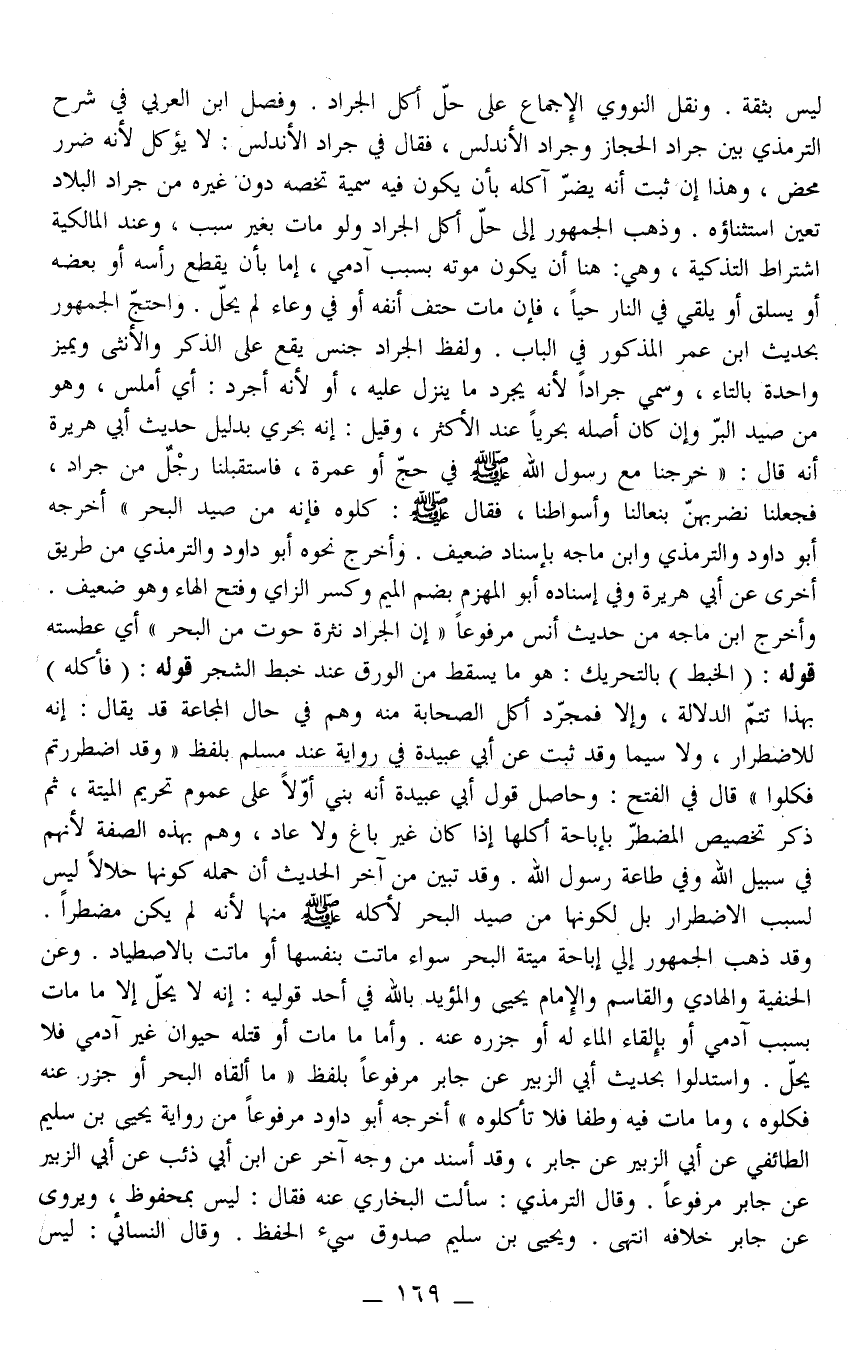 وَاحْتَجَّ الْجُمْهُورُ بِحَدِيثِ ابْنِ عُمَرَ الْمَذْكُورِ فِي الْبَابِ. وَلَفْظِ الْجَرَادِ جِنْسٌ يَقَعُ عَلَى الذَّكَرِ وَالْأُنْثَى وَيُمَيَّزُ وَاحِدُهُ بِالتَّاءِ، وَسُمِّيَ جَرَادًا لِأَنَّهُ يُجَرِّدُ مَا يَنْزِلُ عَلَيْهِ، أَوْ لِأَنَّهُ أَجْرَدُ: أَيْ أَمْلَسُ، وَهُوَ مِنْ صَيْدِ الْبَرِّ وَإِنْ كَانَ أَصْلُهُ بَحْرِيَّا عِنْدَ الْأَكْثَرِ، وَقِيلَ: إنَّهُ بَحْرِيٌّ بِدَلِيلِ حَدِيثِ أَبِي هُرَيْرَةَ أَنَّهُ قَالَ: «خَرَجْنَا مَعَ رَسُولِ اللَّهِ - صَلَّى اللَّهُ عَلَيْهِ وَسَلَّمَ - فِي حَجٍّ أَوْ عُمْرَةٍ، فَاسْتَقْبَلَنَا رَجْلٌ مِنْ جَرَادٍ، فَجَعَلْنَا نَضْرِبُهُنَّ بِنِعَالِنَا وَأَسْوَاطِنَا، فَقَالَ - صَلَّى اللَّهُ عَلَيْهِ وَسَلَّمَ -: كُلُوهُ فَإِنَّهُ مِنْ صَيْدِ الْبَحْرِ» أَخْرَجَهُ أَبُو دَاوُد وَالتِّرْمِذِيُّ وَابْنُ مَاجَهْ بِإِسْنَادٍ ضَعِيفٍ. وَأَخْرَجَ نَحْوَهُ أَبُو دَاوُد وَالتِّرْمِذِيُّ مِنْ طَرِيقٍ أُخْرَى عَنْ أَبِي هُرَيْرَةَ وَفِي إسْنَادِهِ أَبُو الْمُهَزِّمِ بِضَمِّ الْمِيمِ وَكَسْرِ الزَّايِ وَفَتْحِ الْهَاءِ وَهُوَ ضَعِيفٌ.