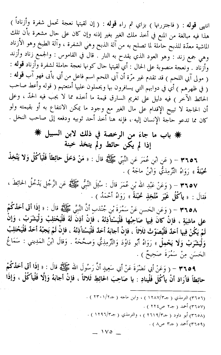 ـــــــــــــــــــــــــــــQانْتَهَى قَوْلُهُ: (فَاجْتَزَرْتُهَا) بِزَايٍ ثُمَّ رَاءٍ قَوْلُهُ: (إنْ لَقِيتَهَا نَعْجَةً تَحْمِلُ شَفْرَةً وَأَزْنَادًا) هَذَا فِيهِ مُبَالَغَةٌ مِنْ الْمَنْعِ فِي أَخْذِ مُلْكِ الْغَيْرِ بِغَيْرِ إذْنِهِ وَإِنْ كَانَ عَلَى حَالٍ مُشْعِرَةٍ بِأَنَّ تِلْكَ الْمَاشِيَةَ مُعَدَّةٌ لِلذَّبْحِ حَامِلَةً لِمَا تَصْلُحُ بِهِ مِنْ آلَةِ الذَّبْحِ وَهِيَ الشَّفْرَةُ، وَآلَةُ الطَّبْخِ وَهُوَ الْأَزْنَادُ وَهِيَ جَمْعُ زَنْدٍ: وَهُوَ الْعُودُ الَّذِي يُقْدَحُ بِهِ النَّارَ. قَالَ فِي الْقَامُوسِ: وَالْجَمْعُ زِنَادٌ وَأَزْنُدُ وَأَزْنَادٌ. وَنَعْجَةً مَنْصُوبَةٌ عَلَى الْحَالِ: أَيْ لَقِيتَهَا حَالَ كَوْنِهَا نَعْجَةً حَامِلَةً لِشَفْرَةٍ وَأَزْنَادٍ قَوْلُهُ: (مَوْلَى آبِي اللَّحْمِ) قَدْ تَقَدَّمَ غَيْرُ مَرَّةٍ أَنَّ آبِي اللَّحْمِ اسْمُ فَاعِلٍ مِنْ أَبَى يَأْبَى فَهُوَ آبٍ قَوْلُهُ: (فِي ظَهْرِهِمْ) أَيْ فِي دَوَابِّهِمْ الَّتِي يُسَافِرُونَ بِهَا وَيَحْمِلُونَ عَلَيْهَا أَمْتِعَتَهُمْ (قَوْلُهُ وَأَعْطِ صَاحِبَ الْحَائِطِ الْآخَرَ) فِيهِ دَلِيلٌ عَلَى تَغْرِيمِ السَّارِقِ قِيمَةَ مَا أَخَذَهُ مِمَّا لَا يَجِبُ فِيهِ الْحَدُّ، وَعَلَى أَنَّ الْحَاجَةَ لَا تُبِيحُ الْإِقْدَامَ عَلَى مَالِ الْغَيْرِ مَعَ وُجُودِ مَا يُمْكِنُ الِانْتِفَاعُ بِهِ أَوْ بِقِيمَتِهِ وَلَوْ كَانَ مِمَّا تَدْعُو حَاجَةُ الْإِنْسَانِ إلَيْهِ، فَإِنَّهُ هُنَا أَخَذَ أَحَدَ ثَوْبَيْهِ وَدَفَعَهُ إلَى صَاحِبِ النَّخْلِ.
