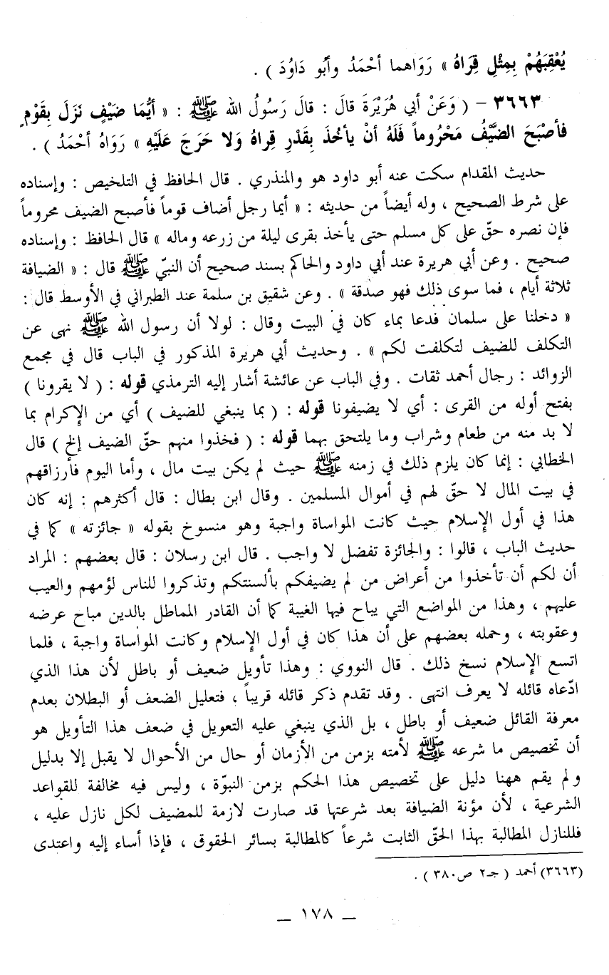 حَدِيثُ الْمِقْدَامِ سَكَتَ عَنْهُ أَبُو دَاوُد هُوَ وَالْمُنْذِرِيُّ. قَالَ الْحَافِظُ فِي التَّلْخِيصِ: وَإِسْنَادُهُ عَلَى شَرْطِ الصَّحِيحِ، وَلَهُ أَيْضًا مِنْ حَدِيثِهِ: «أَيُّمَا رَجُلٍ أَضَافَ قَوْمًا فَأَصْبَحَ الضَّيْفُ مَحْرُومًا فَإِنَّ نَصْرَهُ حَقٌّ عَلَى كُلِّ مُسْلِمٍ حَتَّى يَأْخُذَ بِقِرَى لَيْلَةٍ مِنْ زَرْعِهِ وَمَالِهِ» قَالَ الْحَافِظُ: وَإِسْنَادُهُ صَحِيحٌ.