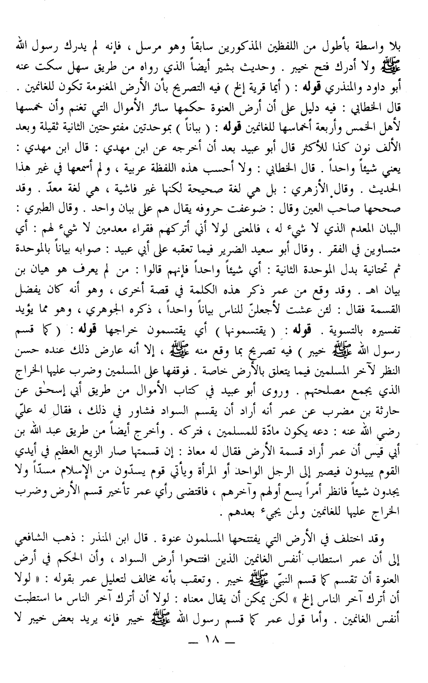 قَالَ ابْنُ الْمُنْذِرِ: ذَهَبَ الشَّافِعِيُّ إلَى أَنَّ عُمَرَ اسْتَطَابَ أَنْفُسَ الْغَانِمِينَ الَّذِينَ افْتَتَحُوا أَرْضَ السَّوَادِ، وَأَنَّ الْحُكْمَ فِي أَرْضِ الْعَنْوَةِ أَنْ تُقْسَمَ كَمَا قَسَمَ النَّبِيُّ - صَلَّى اللَّهُ عَلَيْهِ وَسَلَّمَ - خَيْبَرَ. وَتُعُقِّبَ بِأَنَّهُ مُخَالِفٌ لِتَعْلِيلِ عُمَرَ بِقَوْلِهِ: " لَوْلَا أَنْ أَتْرُكَ آخِرَ النَّاسِ. . . إلَخْ " لَكِنْ يُمْكِنُ أَنْ يُقَالَ مَعْنَاهُ: لَوْلَا أَنْ أَتْرُكَ آخِرَ النَّاسِ مَا اسْتَطَبْتُ أَنْفُسَ الْغَانِمِينَ. وَأَمَّا قَوْلُ عُمَرَ كَمَا قَسَمَ رَسُولُ اللَّهِ - صَلَّى اللَّهُ عَلَيْهِ وَسَلَّمَ - خَيْبَرَ فَإِنَّهُ يُرِيدُ بَعْضَ خَيْبَرَ لَا