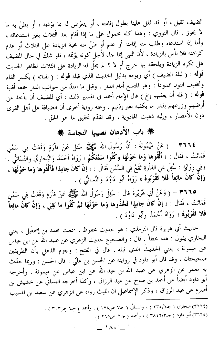 3664 - (عَنْ مَيْمُونَةَ: «أَنَّ رَسُولَ اللَّهِ - صَلَّى اللَّهُ عَلَيْهِ وَسَلَّمَ - سُئِلَ عَنْ فَأْرَةٍ وَقَعَتْ فِي سَمْنٍ فَمَاتَتْ، فَقَالَ: أَلْقُوهَا وَمَا حَوْلَهَا وَكُلُوا سَمْنَكُمْ» رَوَاهُ أَحْمَدُ وَالْبُخَارِيُّ وَالنَّسَائِيُّ.