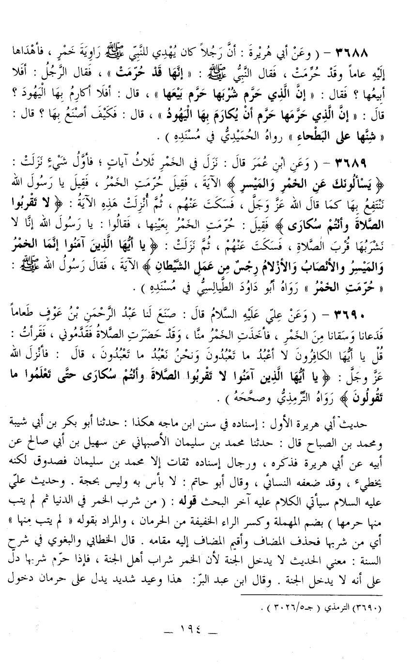 3689 - (وَعَنْ ابْنِ عُمَرَ قَالَ: «نَزَلَ فِي الْخَمْرِ ثَلَاثُ آيَاتٍ، فَأَوَّلُ شَيْءٍ نَزَلَتْ: {يَسْأَلُونَكَ عَنِ الْخَمْرِ وَالْمَيْسِرِ} [البقرة: 219] الْآيَةَ فَقِيلَ حُرِّمَتْ الْخَمْرُ، فَقِيلَ يَا رَسُولَ اللَّهِ نَنْتَفِعُ بِهَا كَمَا قَالَ اللَّهُ عَزَّ وَجَلَّ، فَسَكَتَ عَنْهُمْ، ثُمَّ أُنْزِلَتْ هَذِهِ الْآيَةُ: {لا تَقْرَبُوا الصَّلاةَ وَأَنْتُمْ سُكَارَى} [النساء: 43] فَقِيلَ: حُرِّمَتْ الْخَمْرُ بِعَيْنِهَا، فَقَالُوا: يَا رَسُولَ اللَّه إنَّا لَا نَشْرَبُهَا قُرْبَ الصَّلَاةِ، فَسَكَتَ عَنْهُمْ، ثُمَّ نَزَلَتْ: {يَا أَيُّهَا الَّذِينَ آمَنُوا إِنَّمَا الْخَمْرُ وَالْمَيْسِرُ وَالأَنْصَابُ وَالأَزْلامُ رِجْسٌ مِنْ عَمَلِ الشَّيْطَانِ} [المائدة: 90] الْآيَةَ فَقَالَ رَسُولُ اللَّهِ - صَلَّى اللَّهُ عَلَيْهِ وَسَلَّمَ -: حُرِّمَتْ الْخَمْرُ» رَوَاهُ أَبُو دَاوُد الطَّيَالِسِيُّ فِي مُسْنَدِهِ) .