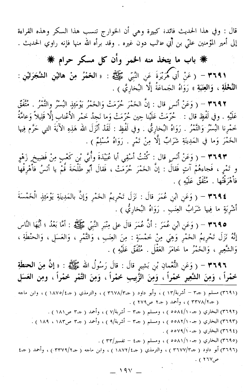 3696 - (وَعَنْ النُّعْمَانِ بْنِ بَشِيرٍ قَالَ: قَالَ رَسُولُ اللَّهِ - صَلَّى اللَّهُ عَلَيْهِ وَسَلَّمَ -: «إنَّ مِنْ الْحِنْطَةِ خَمْرًا، وَمِنْ الشَّعِيرِ خَمْرًا، وَمِنْ الزَّبِيبِ خَمْرًا، وَمِنْ التَّمْرِ خَمْرًا، وَمِنْ الْعَسَلِ