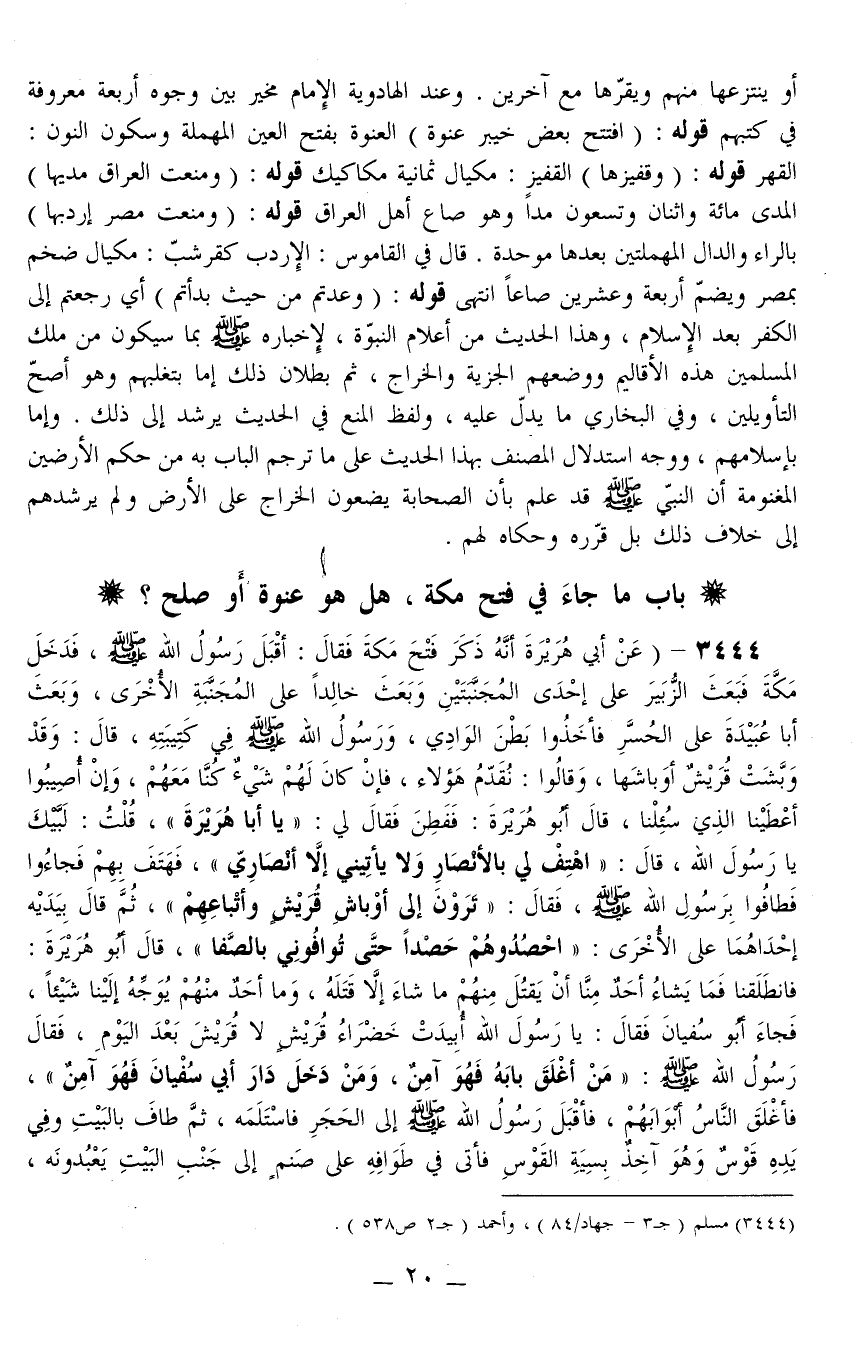 3444 - (عَنْ أَبِي هُرَيْرَةَ أَنَّهُ ذَكَرَ فَتْحَ مَكَّةَ فَقَالَ: «أَقْبَلَ رَسُولُ اللَّهِ - صَلَّى اللَّهُ عَلَيْهِ وَسَلَّمَ - فَدَخَلَ مَكَّةَ فَبَعَثَ الزُّبَيْرَ عَلَى إحْدَى الْمُجَنَّبَتَيْنِ وَبَعَثَ خَالِدًا عَلَى الْمُجَنَّبَةِ الْأُخْرَى، وَبَعَثَ أَبَا عُبَيْدَةَ عَلَى الْحُسَّرِ فَأَخَذُوا بَطْنَ الْوَادِي، وَرَسُولُ اللَّهِ - صَلَّى اللَّهُ عَلَيْهِ وَسَلَّمَ - فِي كَتِيبَتِهِ، قَالَ: وَقَدْ وَبَّشَتْ قُرَيْشٌ أَوْبَاشَهَا، وَقَالُوا: نُقَدِّمُ هَؤُلَاءِ، فَإِنْ كَانَ لَهُمْ شَيْءٌ كُنَّا مَعَهُمْ، وَإِنْ أُصِيبُوا أَعْطَيْنَا الَّذِي سُئِلْنَا، قَالَ أَبُو هُرَيْرَةَ: فَفَطِنَ فَقَالَ لِي: يَا أَبَا هُرَيْرَةَ قُلْت: لَبَّيْكَ يَا رَسُولَ اللَّهِ، قَالَ: اهْتِفْ لِي بِالْأَنْصَارِ وَلَا يَأْتِينِي إلَّا أَنْصَارِيٌّ، فَهَتَفَ بِهِمْ فَجَاءُوا فَطَافُوا بِرَسُولِ اللَّهِ - صَلَّى اللَّهُ عَلَيْهِ وَسَلَّمَ - فَقَالَ: تَرَوْنَ إلَى أَوْبَاشِ قُرَيْشٍ وَأَتْبَاعِهِمْ، ثُمَّ قَالَ بِيَدَيْهِ إحْدَاهُمَا عَلَى الْأُخْرَى: اُحْصُدُوهُمْ حَصَدًا حَتَّى تُوَافُونِي بِالصَّفَا. قَالَ أَبُو هُرَيْرَةَ: فَانْطَلَقْنَا فَمَا يَشَاءُ أَحَدٌ مِنَّا أَنْ يَقْتُلَ مِنْهُمْ مَا شَاءَ إلَّا قَتَلَهُ، وَمَا أَحَدٌ مِنْهُمْ يُوَجِّهُ إلَيْنَا شَيْئًا، فَجَاءَ أَبُو سُفْيَانَ فَقَالَ: يَا رَسُولَ اللَّهِ أُبِيدَتْ خَضْرَاءُ قُرَيْشٍ لَا قُرَيْشَ بَعْدَ الْيَوْمِ، فَقَالَ رَسُولُ اللَّهِ - صَلَّى اللَّهُ عَلَيْهِ وَسَلَّمَ -: مَنْ أَغْلَقَ بَابَهُ فَهُوَ آمِنٌ، وَمَنْ دَخَلَ دَارَ أَبِي سُفْيَانَ فَهُوَ آمِنٌ، فَأَغْلَقَ النَّاسُ أَبْوَابَهُمْ، فَأَقْبَلَ رَسُولُ اللَّهِ - صَلَّى اللَّهُ عَلَيْهِ وَسَلَّمَ - إلَى الْحَجَرِ فَاسْتَلَمَهُ، ثُمَّ طَافَ بِالْبَيْتِ وَفِي يَدِهِ قَوْسٌ وَهُوَ آخِذٌ بِسِيَةِ الْقَوْسِ فَأَتَى فِي طَوَافِهِ عَلَى صَنَمٍ إلَى جَنْبِ الْبَيْتِ يَعْبُدُونَهُ،