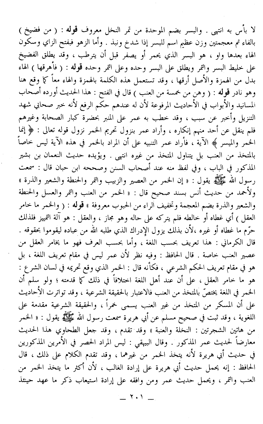 قَالَ الْحَافِظُ: وَفِيهِ نَظَرٌ لِأَنَّ عُمَرَ لَيْسَ فِي مَقَامِ تَعْرِيفِ اللُّغَةِ، بَلْ هُوَ فِي مَقَامِ تَعْرِيفِ الْحُكْمِ الشَّرْعِيِّ، فَكَأَنَّهُ قَالَ: الْخَمْرُ الَّذِي وَقَعَ تَحْرِيمُهُ فِي لِسَانِ الشَّرْعِ: هُوَ مَا خَامَرَ الْعَقْلَ، عَلَى أَنَّ عِنْدَ أَهْلِ اللُّغَةِ اخْتِلَافَا فِي ذَلِكَ كَمَا قَدَّمْتُهُ، وَلَوْ سَلِمَ أَنَّ الْخَمْرَ فِي اللُّغَةِ يَخْتَصُّ بِالْمُتَّخَذِ مِنْ الْعِنَبِ فَالِاعْتِبَارُ بِالْحَقِيقَةِ الشَّرْعِيَّةِ، وَقَدْ تَوَاتَرَتْ الْأَحَادِيثُ عَلَى أَنَّ الْمُسْكِرَ مِنْ الْمُتَّخَذِ مِنْ غَيْرِ الْعِنَبِ يُسَمَّى خَمْرًا، وَالْحَقِيقَةُ الشَّرْعِيَّةُ مُقَدَّمَةٌ عَلَى اللُّغَوِيَّةِ، وَقَدْ ثَبَتَ فِي صَحِيحِ مُسْلِمٍ عَنْ أَبِي هُرَيْرَةَ سَمِعْتُ رَسُولَ اللَّهِ - صَلَّى اللَّهُ عَلَيْهِ وَسَلَّمَ - يَقُولُ: «الْخَمْرُ مِنْ هَاتَيْنِ الشَّجَرَتَيْنِ: النَّخْلَةُ وَالْعِنَبَةُ» وَقَدْ تَقَدَّمَ، وَقَدْ جَعَلَ الطَّحَاوِيَّ هَذَا الْحَدِيثَ مُعَارِضًا لِحَدِيثِ عُمَرَ الْمَذْكُورِ.