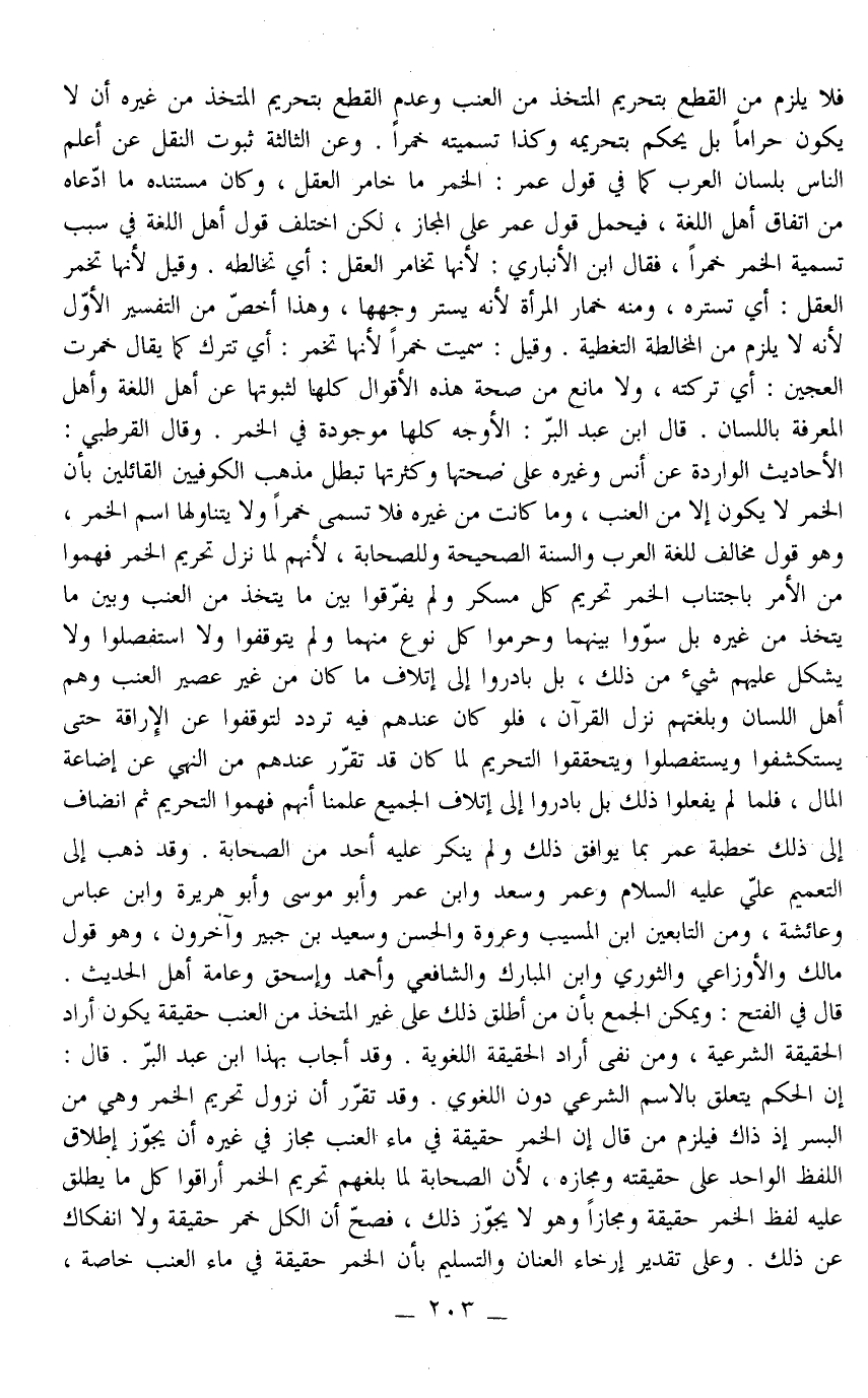 وَقَدْ ذَهَبَ إلَى التَّعْمِيمِ عَلِيٌّ - عَلَيْهِ السَّلَامُ - وَعُمَرُ وَسَعْدٌ وَابْنُ عُمَرَ وَأَبُو مُوسَى وَأَبُو هُرَيْرَةَ وَابْنُ عَبَّاسٍ وَعَائِشَةُ، وَمِنْ التَّابِعِينَ ابْنُ الْمُسَيِّبِ وَعُرْوَةُ وَالْحَسَنُ وَسَعِيدُ بْنُ جُبَيْرٍ وَآخَرُونَ، وَهُوَ قَوْلُ مَالِكٍ وَالْأَوْزَاعِيِّ وَالثَّوْرِيِّ وَابْنِ الْمُبَارَكِ وَالشَّافِعِيِّ وَأَحْمَدَ وَإِسْحَاقَ وَعَامَّةِ أَهْلِ الْحَدِيثِ. قَالَ فِي الْفَتْحِ: وَيُمْكِنُ الْجَمْعُ بِأَنَّ مَنْ أَطْلَقَ ذَلِكَ عَلَى غَيْرِ الْمُتَّخَذِ مِنْ الْعِنَبِ حَقِيقَةً يَكُونُ أَرَادَ الْحَقِيقَةَ الشَّرْعِيَّةَ، وَمَنْ نَفَى أَرَادَ الْحَقِيقَةَ اللُّغَوِيَّةَ. وَقَدْ أَجَابَ بِهَذَا ابْنُ عَبْدِ الْبَرِّ. قَالَ: أَنَّ الْحُكْمَ يَتَعَلَّقُ بِالِاسْمِ الشَّرْعِيِّ دُونَ اللُّغَوِيِّ.