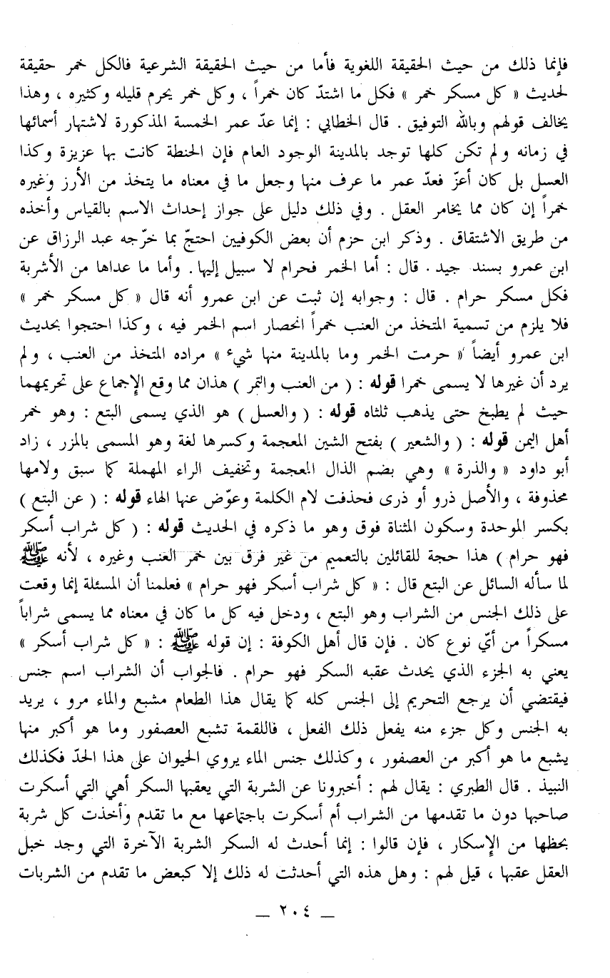 قَالَ: أَمَّا الْخَمْرُ فَحَرَامٌ لَا سَبِيلَ إلَيْهَا. وَأَمَّا مَا عَدَاهَا مِنْ الْأَشْرِبَةِ فَكُلُّ مُسْكِرٍ حَرَامٌ. قَالَ: وَجَوَابُهُ إنْ ثَبَتَ عَنْ ابْنِ عَمْرٍو أَنَّهُ قَالَ " كُلُّ مُسْكِرٍ خَمْرٌ " فَلَا يَلْزَمُ مِنْ تَسْمِيَةِ الْمُتَّخَذِ مِنْ الْعِنَبِ خَمْرًا انْحِصَارُ اسْمِ الْخَمْرِ فِيهِ، وَكَذَا احْتَجُّوا بِحَدِيثِ ابْنِ عَمْرٍو أَيْضًا «حُرِّمَتْ الْخَمْرُ وَمَا بِالْمَدِينَةِ مِنْهَا شَيْءٌ» مُرَادُهُ الْمُتَّخَذُ مِنْ الْعِنَبِ، وَلَمْ يَرِدْ أَنَّ غَيْرَهَا لَا يُسَمَّى خَمْرًا قَوْلُهُ: (مِنْ الْعِنَبِ وَالتَّمْرِ) هَذَانِ مِمَّا وَقَعَ الْإِجْمَاعُ عَلَى تَحْرِيمِهِمَا حَيْثُ لَمْ يُطْبَخْ حَتَّى يَذْهَبَ ثُلُثَاهُ قَوْلُهُ: (وَالْعَسَلِ) هُوَ الَّذِي يُسَمَّى الْبِتْعُ: وَهُوَ خَمْرُ أَهْلِ الْيَمَنِ قَوْلُهُ: (وَالشَّعِيرِ) بِفَتْحِ الشِّينِ الْمُعْجَمَةِ وَكَسْرِهَا لُغَةٌ وَهُوَ الْمُسَمَّى بِالْمِزْرِ، زَادَ أَبُو دَاوُد " وَالذُّرَةِ " وَهِيَ بِضَمِّ الذَّالِ الْمُعْجَمَةِ وَتَخْفِيفِ الرَّاءِ الْمُهْمَلَةِ كَمَا سَبَقَ وَلَامُهَا مَحْذُوفَةٌ، وَالْأَصْلُ ذَرْوٌ أَوْ ذُرًى فَحُذِفَتْ لَامُ الْكَلِمَةِ وَعُوِّضَ عَنْهَا الْهَاءُ قَوْلُهُ: (عَنْ الْبِتْعِ) بِكَسْرِ الْمُوَحَّدَةِ وَسُكُونِ الْمُثَنَّاةِ فَوْقُ وَهُوَ مَا ذَكَرَهُ فِي الْحَدِيثِ قَوْلُهُ: (كُلُّ شَرَابٍ أَسْكَرَ فَهُوَ حَرَامٌ) هَذَا حُجَّةٌ لِلْقَائِلِينَ بِالتَّعْمِيمِ مِنْ غَيْرِ فَرْقٍ بَيْنَ خَمْرِ الْعِنَبِ وَغَيْرِهِ؛ لِأَنَّهُ - صَلَّى اللَّهُ عَلَيْهِ وَسَلَّمَ - لَمَّا سَأَلَهُ السَّائِلُ عَنْ الْبِتْعِ قَالَ: «كُلُّ شَرَابٍ أَسْكَرَ فَهُوَ حَرَامٌ» فَعَلِمْنَا أَنَّ الْمَسْأَلَةَ إنَّمَا وَقَعَتْ عَلَى ذَلِكَ الْجِنْسِ مِنْ الشَّرَابِ وَهُوَ الْبِتْعُ، وَدَخَلَ فِيهِ كُلُّ مَا كَانَ فِي مَعْنَاهُ مِمَّا يُسَمَّى شَرَابًا مُسْكِرًا مِنْ أَيِّ نَوْعٍ كَانَ.