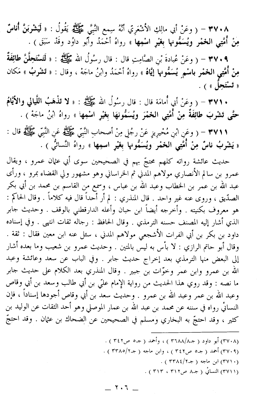 3709 - (وَعَنْ عُبَادَةَ بْنِ الصَّامِتِ قَالَ: قَالَ رَسُولُ اللَّهِ - صَلَّى اللَّهُ عَلَيْهِ وَسَلَّمَ -: «لَتَسْتَحِلَّنَّ طَائِفَةٌ مِنْ أُمَّتِي الْخَمْرَ بِاسْمٍ يُسَمُّونَهَا إيَّاهُ» رَوَاهُ أَحْمَدُ وَابْنُ مَاجَهْ، وَقَالَ: " تَشْرَبُ " مَكَانَ " تَسْتَحِلُّ ") .