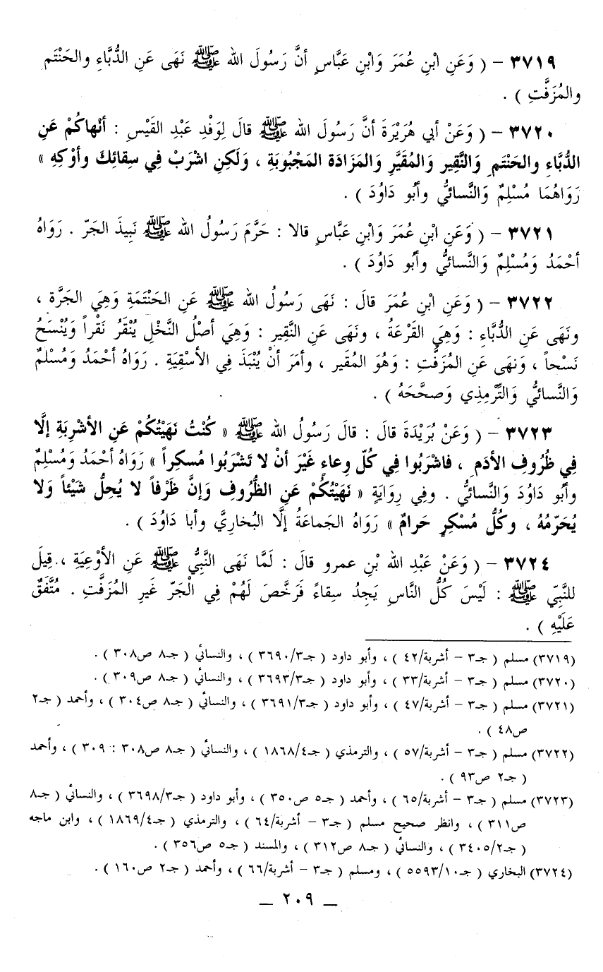 3722 - (وَعَنْ ابْنِ عُمَرَ قَالَ: «نَهَى رَسُولُ اللَّهِ - صَلَّى اللَّهُ عَلَيْهِ وَسَلَّمَ - عَنْ الْحَنْتَمَةِ» وَهِيَ الْجَرَّةُ، وَنَهَى عَنْ الدُّبَّاءِ: وَهِيَ الْقَرْعَةُ، وَنَهَى عَنْ النَّقِيرِ: وَهِيَ أَصْلُ النَّخْلِ يُنْقَرُ نَقْرًا وَيُنْسَخُ نَسْخًا، وَنَهَى عَنْ الْمُزَفَّتِ: وَهُوَ الْمُقَيَّرُ، وَأَمَرَ أَنْ يُنْبَذَ فِي الْأَسْقِيَةِ. رَوَاهُ أَحْمَدُ وَمُسْلِمٌ وَالنَّسَائِيُّ وَالتِّرْمِذِيُّ وَصَحَّحَهُ) .