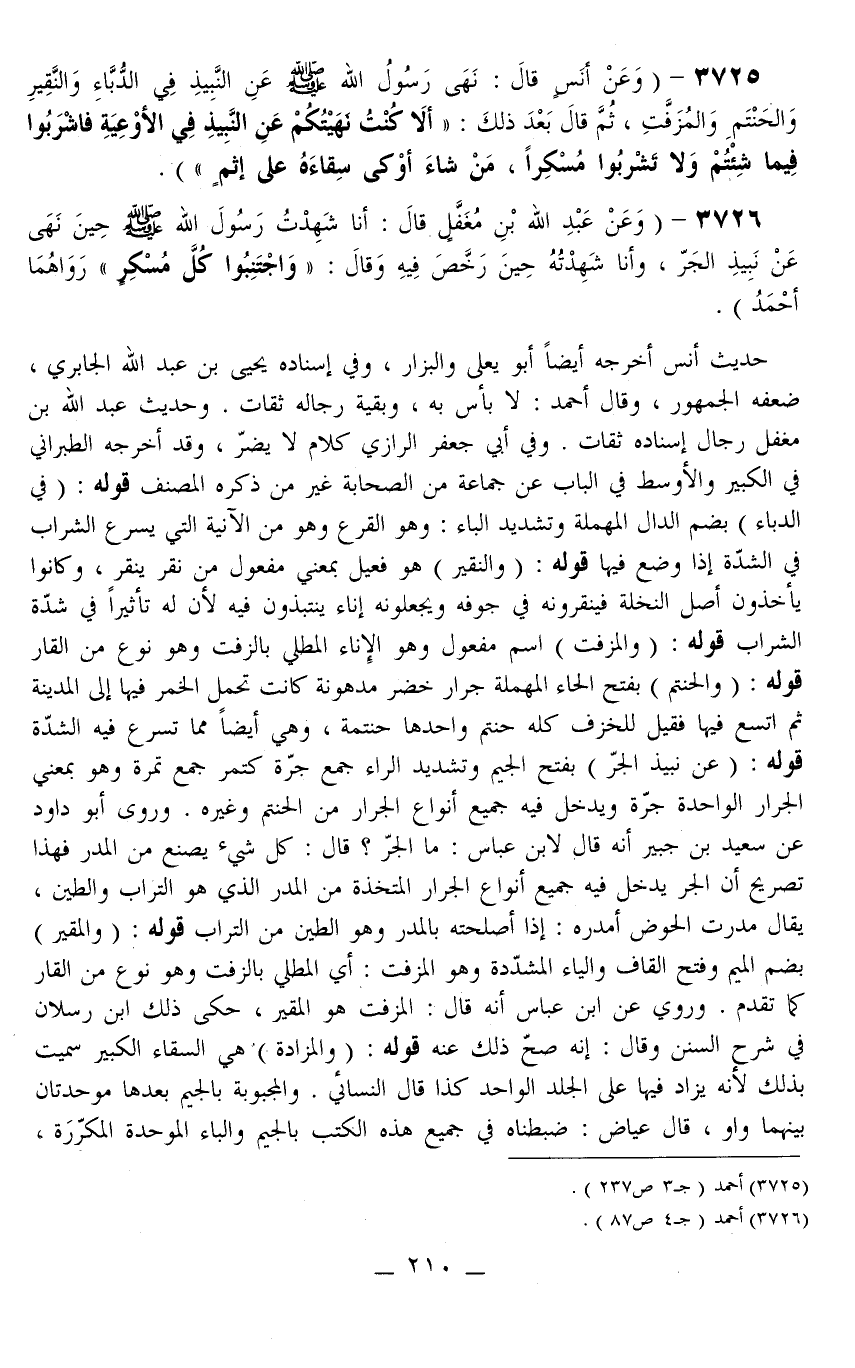 وَعَنْ أَنَسٍ قَالَ: «نَهَى رَسُولُ اللَّهِ - صَلَّى اللَّهُ عَلَيْهِ وَسَلَّمَ - عَنْ النَّبِيذِ فِي الدُّبَّاءِ وَالنَّقِيرِ وَالْحَنْتَمِ وَالْمُزَفَّتِ، ثُمَّ قَالَ بَعْدَ ذَلِكَ: أَلَا كُنْتُ نَهَيْتُكُمْ عَنْ النَّبِيذِ فِي الْأَوْعِيَةِ فَاشْرَبُوا فِيمَا شِئْتُمْ وَلَا تَشْرَبُوا مُسْكِرًا، مَنْ شَاءَ أَوْكَى سِقَاءَهُ عَلَى إثْمٍ» ) .