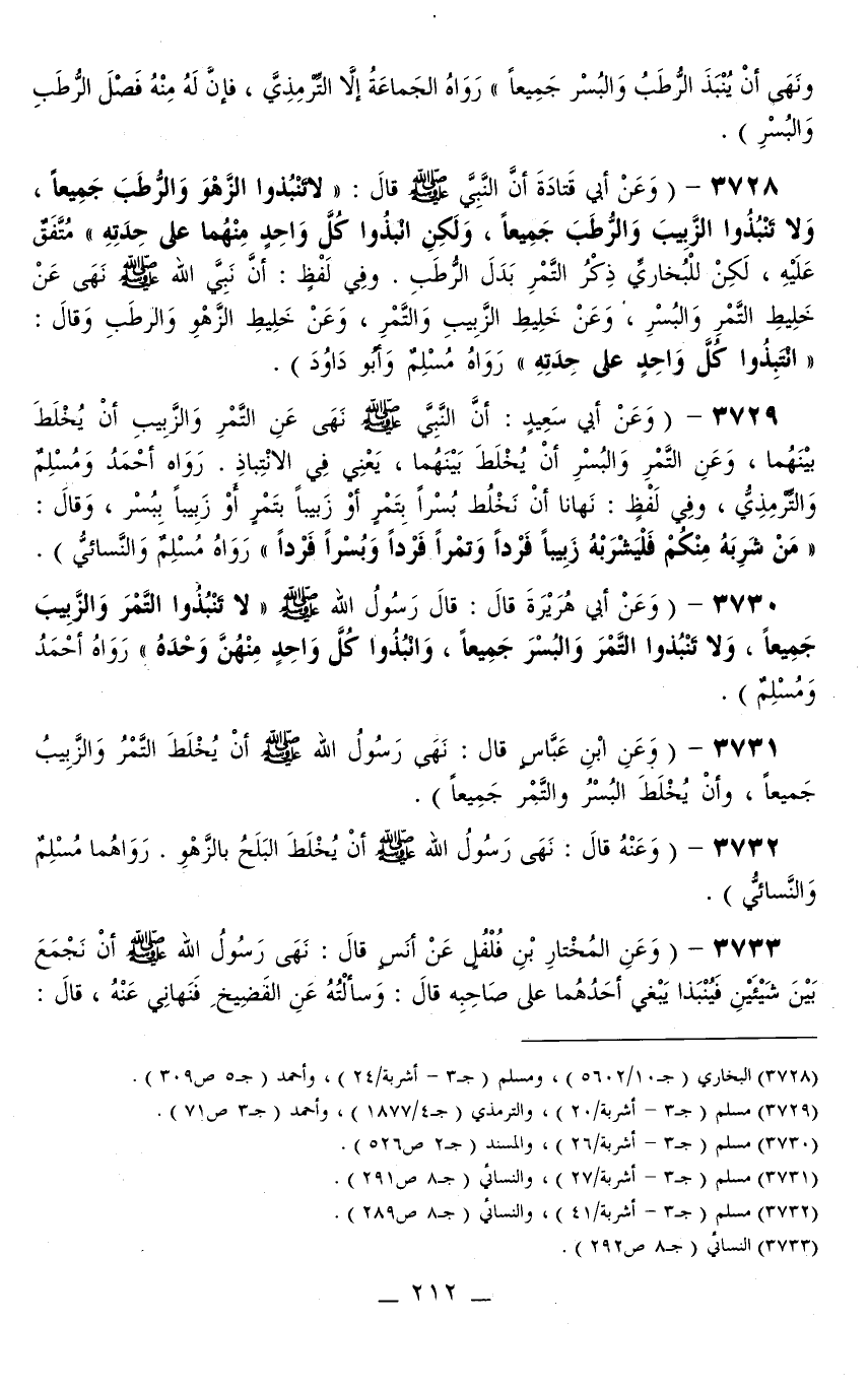 3730 - (وَعَنْ أَبِي هُرَيْرَةَ قَالَ: قَالَ رَسُولُ اللَّهِ - صَلَّى اللَّهُ عَلَيْهِ وَسَلَّمَ - «لَا تَنْبِذُوا التَّمْرَ وَالزَّبِيبَ جَمِيعًا، وَلَا تَنْبِذُوا التَّمْرَ وَالْبُسْرَ جَمِيعًا، وَانْبِذُوا كُلَّ وَاحِدٍ مِنْهُنَّ وَحْدَهُ» رَوَاهُ أَحْمَدُ وَمُسْلِمٌ) .