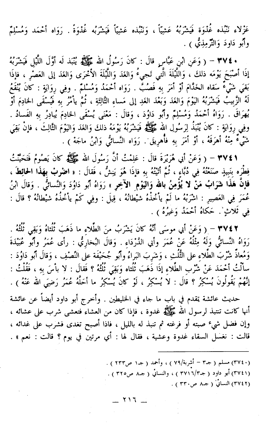 عَزْلَاءُ نَنْبِذُهُ غُدْوَةً فَيَشْرَبُهُ عَشِيًّا، وَنَنْبِذُهُ عَشِيًّا فَيَشْرَبُهُ غُدْوَةً» . رَوَاهُ أَحْمَدُ وَمُسْلِمٌ وَأَبُو دَاوُد وَالتِّرْمِذِيُّ)