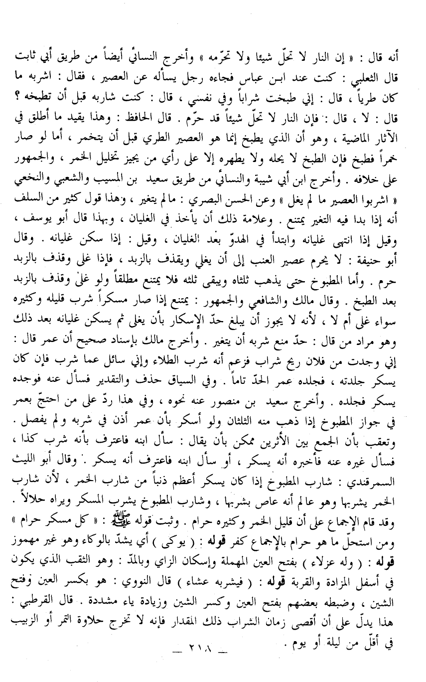ـــــــــــــــــــــــــــــQأَنَّهُ قَالَ: " إنَّ النَّارَ لَا تُحِلُّ شَيْئًا وَلَا تُحَرِّمُهُ " وَأَخْرَجَ النَّسَائِيّ أَيْضًا مِنْ طَرِيقِ أَبِي ثَابِتٍ قَالَ الثَّعْلَبِيُّ: كُنْتُ عِنْدَ ابْنِ عَبَّاسٍ فَجَاءَهُ رَجُلٌ يَسْأَلُهُ عَنْ الْعَصِيرِ، فَقَالَ: اشْرَبْهُ مَا كَانَ طَرِيًّا، قَالَ: إنِّي طَبَخْتُ شَرَابًا وَفِي نَفْسِي، قَالَ: كُنْتَ شَارِبَهُ قَبْلَ أَنْ تَطْبُخَهُ؟ قَالَ: لَا، قَالَ: فَإِنَّ النَّارَ لَا تُحِلُّ شَيْئًا قَدْ حُرِّمَ. قَالَ الْحَافِظُ: وَهَذَا يُقَيِّدُ مَا أُطْلِقَ فِي الْآثَارِ الْمَاضِيَةِ، وَهُوَ أَنَّ الَّذِي يُطْبَخُ إنَّمَا هُوَ الْعَصِيرُ الطَّرِيُّ قَبْلَ أَنْ يَتَخَمَّرَ، أَمَّا لَوْ صَارَ خَمْرًا فَطُبِخَ فَإِنَّ الطَّبْخَ لَا يُحِلّهُ وَلَا يُطَهِّرُهُ إلَّا عَلَى رَأْيِ مَنْ يُجِيزُ تَخْلِيلَ الْخَمْرِ، وَالْجُمْهُورُ عَلَى خِلَافِهِ. وَأَخْرَجَ ابْنُ أَبِي شَيْبَةَ وَالنَّسَائِيُّ مِنْ طَرِيقِ سَعِيدِ بْنِ الْمُسَيِّبِ وَالشَّعْبِيِّ وَالنَّخَعِيِّ " اشْرَبُوا الْعَصِيرَ مَا لَمْ يَغْلِ " وَعَنْ الْحَسَنِ الْبَصْرِيِّ: مَا لَمْ يَتَغَيَّرْ، وَهَذَا قَوْلُ كَثِيرٍ مِنْ السَّلَفِ أَنَّهُ إذَا بَدَا فِيهِ التَّغَيُّرُ يَمْتَنِعُ.