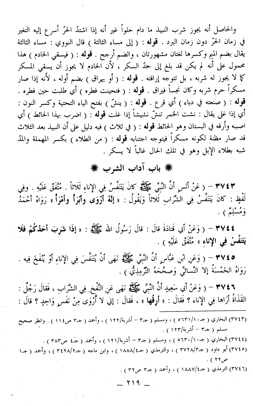 3745 - (وَعَنْ ابْنِ عَبَّاسٍ أَنَّ النَّبِيَّ - صَلَّى اللَّهُ عَلَيْهِ وَسَلَّمَ - «نَهَى أَنْ يُتَنَفَّسَ فِي الْإِنَاءِ أَوْ يُنْفَخَ فِيهِ» . رَوَاهُ الْخَمْسَةُ إلَّا النَّسَائِيّ وَصَحَّحَهُ التِّرْمِذِيُّ) .