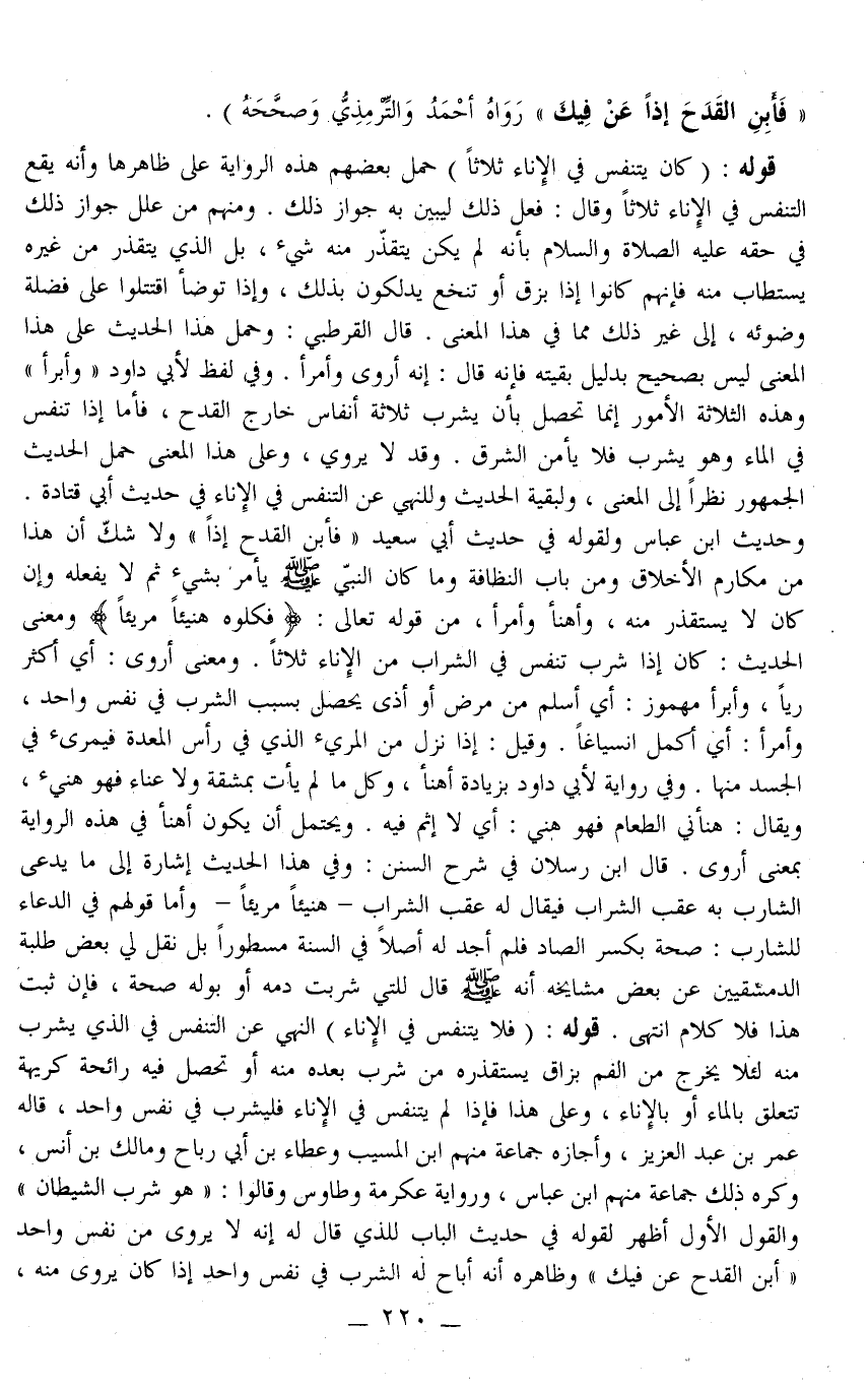 فَأَبِنْ الْقَدَحَ إذًا عَنْ فِيك» رَوَاهُ أَحْمَدُ وَالتِّرْمِذِيُّ وَصَحَّحَهُ)