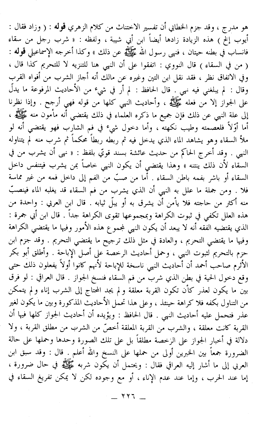 قَالَ الْحَافِظُ: لَمْ أَرَ فِي شَيْءٍ مِنْ الْأَحَادِيثِ الْمَرْفُوعَةِ مَا يَدُلُّ عَلَى الْجَوَازِ إلَّا مِنْ فِعْلِهِ - صَلَّى اللَّهُ عَلَيْهِ وَسَلَّمَ -، وَأَحَادِيثُ النَّهْيِ كُلُّهَا مِنْ قَوْلِهِ فَهِيَ أَرْجَحُ. وَإِذَا نَظَرْنَا إلَى عِلَّةِ النَّهْيِ عَنْ ذَلِكَ فَإِنَّ جَمِيعَ مَا ذَكَرَهُ الْعُلَمَاءُ فِي ذَلِكَ يَقْتَضِي أَنَّهُ مَأْمُونٌ مِنْهُ - صَلَّى اللَّهُ عَلَيْهِ وَسَلَّمَ -، أَمَّا أَوَّلَا فَلِعِصْمَتِهِ وَطِيبِ نَكْهَتِهِ، وَأَمَّا دُخُولُ شَيْءٍ فِي فَمِ الشَّارِبِ فَهُوَ يَقْتَضِي أَنَّهُ لَوْ مَلَأَ السِّقَاءَ وَهُوَ يُشَاهِدُ الْمَاءَ الَّذِي يَدْخُلُ فِيهِ ثُمَّ رَبَطَهُ رَبْطًا مُحْكَمًا ثُمَّ شَرِبَ مِنْهُ لَمْ يَتَنَاوَلْهُ النَّهْيُ.