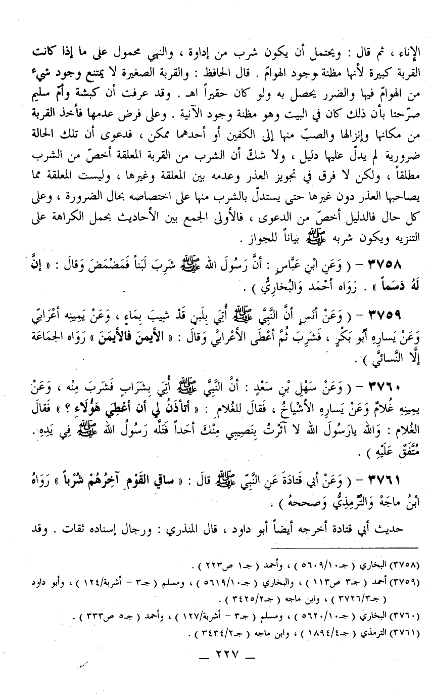 3759 - (وَعَنْ أَنَسٍ «أَنَّ النَّبِيَّ - صَلَّى اللَّهُ عَلَيْهِ وَسَلَّمَ - أُتِيَ بِلَبَنٍ قَدْ شِيبَ بِمَاءٍ، وَعَنْ يَمِينِهِ أَعْرَابِيٌّ وَعَنْ يَسَارِهِ أَبُو بَكْرٍ، فَشَرِبَ ثُمَّ أَعْطَى الْأَعْرَابِيَّ وَقَالَ: الْأَيْمَنَ فَالْأَيْمَنَ» رَوَاهُ الْجَمَاعَةُ إلَّا النَّسَائِيّ) .