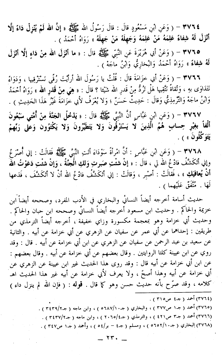 حَدِيثُ أُسَامَةَ أَخْرَجَهُ أَيْضًا النَّسَائِيّ وَالْبُخَارِيُّ فِي الْأَدَبِ الْمُفْرَدِ، وَصَحَّحَهُ أَيْضًا ابْنُ خُزَيْمَةَ وَالْحَاكِمُ. وَحَدِيثُ ابْنِ مَسْعُودٍ أَخْرَجَهُ أَيْضًا النَّسَائِيّ وَصَحَّحَهُ ابْنُ حِبَّانَ وَالْحَاكِمُ. وَحَدِيثُ أَبِي خِزَامَةَ وَهُوَ بِمُعْجَمَةٍ مَكْسُورَةٍ وَزَايٍ خَفِيفَةٍ، أَخْرَجَهُ أَيْضًا التِّرْمِذِيُّ مِنْ طَرِيقَيْنِ: إحْدَاهُمَا عَنْ أَبِي عُمَرَ عَنْ سُفْيَانَ عَنْ الزُّهْرِيِّ عَنْ أَبِي خُزَامَةَ عَنْ أَبِيهِ. وَالثَّانِيَةُ عَنْ سَعِيدِ بْنِ عَبْدِ الرَّحْمَنِ عَنْ سُفْيَانَ عَنْ الزُّهْرِيِّ عَنْ ابْنِ أَبِي خِزَامَةَ عَنْ أَبِيهِ. قَالَ: وَقَدْ رُوِيَ عَنْ ابْنِ عُيَيْنَةَ كِلْتَا الرِّوَايَتَيْنِ. وَقَالَ بَعْضُهُمْ عَنْ أَبِي خُزَامَةَ عَنْ أَبِيهِ. وَقَالَ بَعْضُهُمْ: عَنْ ابْنِ أَبِي خُزَامَةَ عَنْ أَبِيهِ قَالَ: وَقَدْ رَوَى هَذَا الْحَدِيثَ غَيْرُ ابْنِ عُيَيْنَةَ عَنْ الزُّهْرِيِّ عَنْ أَبِي خِزَامَةَ عَنْ أَبِيهِ وَهَذَا أَصَحُّ، وَلَا يُعْرَفُ لِأَبِي خِزَامَةَ عَنْ أَبِيهِ غَيْرُ هَذَا الْحَدِيثِ اهـ كَلَامُهُ، وَقَدْ صَرَّحَ بِأَنَّهُ حَدِيثٌ حَسَنٌ وَهُوَ كَمَا قَالَ. قَوْلُهُ: (فَإِنَّ اللَّهَ لَمْ يُنْزِلْ دَاءً)