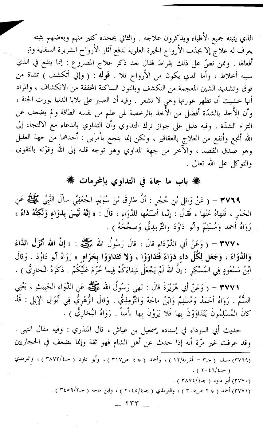 3769 - (عَنْ وَائِلِ بْنِ حُجْرٍ: «أَنَّ طَارِقَ بْنَ سُوَيْد الْجُعْفِيُّ سَأَلَ النَّبِيَّ - صَلَّى اللَّهُ عَلَيْهِ وَسَلَّمَ - عَنْ الْخَمْرِ، فَنَهَاهُ عَنْهَا، فَقَالَ: إنَّمَا أَصْنَعُهَا لِلدَّوَاءِ، قَالَ: إنَّهُ لَيْسَ بِدَوَاءٍ وَلَكِنَّهُ دَاءٌ» رَوَاهُ أَحْمَدُ وَمُسْلِمٌ وَأَبُو دَاوُد وَالتِّرْمِذِيُّ وَصَحَّحَهُ) .