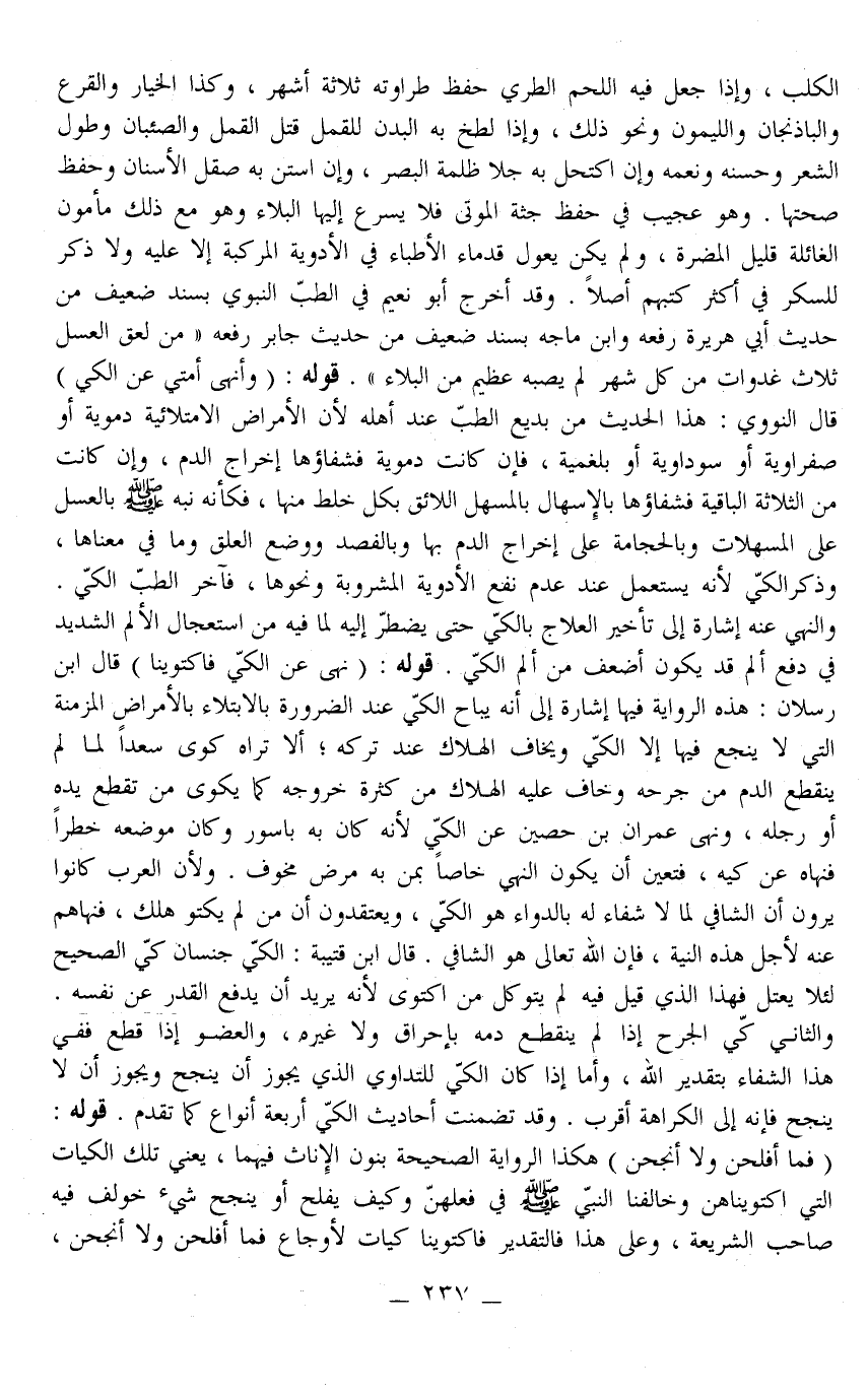 وَالنَّهْيُ عَنْهُ إشَارَةٌ إلَى تَأْخِيرِ الْعِلَاجِ بِالْكَيِّ حَتَّى يُضْطَرَّ إلَيْهِ مَا فِيهِ مِنْ اسْتِعْجَالِ الْأَلَمِ الشَّدِيدِ فِي دَفْعِ أَلَمٍ قَدْ يَكُونُ أَضْعَفَ مِنْ أَلَمِ الْكَيِّ قَوْلُهُ: (نَهَى عَنْ الْكَيِّ فَاكْتَوَيْنَا) قَالَ ابْنُ رَسْلَانَ: هَذِهِ الرِّوَايَةُ فِيهَا إشَارَةٌ إلَى أَنَّهُ يُبَاحُ الْكَيُّ عِنْدَ الضَّرُورَةِ بِالِابْتِلَاءِ بِالْأَمْرَاضِ الْمُزْمِنَةِ الَّتِي لَا يَنْجَعُ فِيهَا إلَّا الْكَيُّ وَيُخَافُ الْهَلَاكُ عِنْدَ تَرْكِهِ، أَلَا تَرَاهُ كَوَى سَعْدًا لَمَّا لَمْ يَنْقَطِعْ الدَّمُ مِنْ جُرْحِهِ وَخَافَ عَلَيْهِ الْهَلَاكَ مِنْ كَثْرَةِ خُرُوجِهِ كَمَا يُكْوَى مَنْ تُقْطَعُ يَدُهُ أَوْ رِجْلُهُ، وَنَهَى عِمْرَانَ بْنَ حُصَيْنٍ عَنْ الْكَيِّ لِأَنَّهُ كَانَ بِهِ بَاسُورٌ وَكَانَ مَوْضِعُهُ خَطَرًا فَنَهَاهُ عَنْ كيه، فَتَعَيَّنَ أَنْ يَكُونَ النَّهْيُ خَاصًّا بِمَنْ بِهِ مَرَضٌ مَخُوفٌ. وَلِأَنَّ الْعَرَبَ كَانُوا يَرَوْنَ أَنَّ الشَّافِي لِمَا لَا شِفَاءَ لَهُ بِالدَّوَاءِ هُوَ الْكَيُّ، وَيَعْتَقِدُونَ أَنَّ مَنْ لَمْ يَكْتَوِ هَلَكَ، فَنَهَاهُمْ عَنْهُ لِأَجْلِ هَذِهِ النِّيَّةِ، فَإِنَّ اللَّهَ تَعَالَى هُوَ الشَّافِي.
