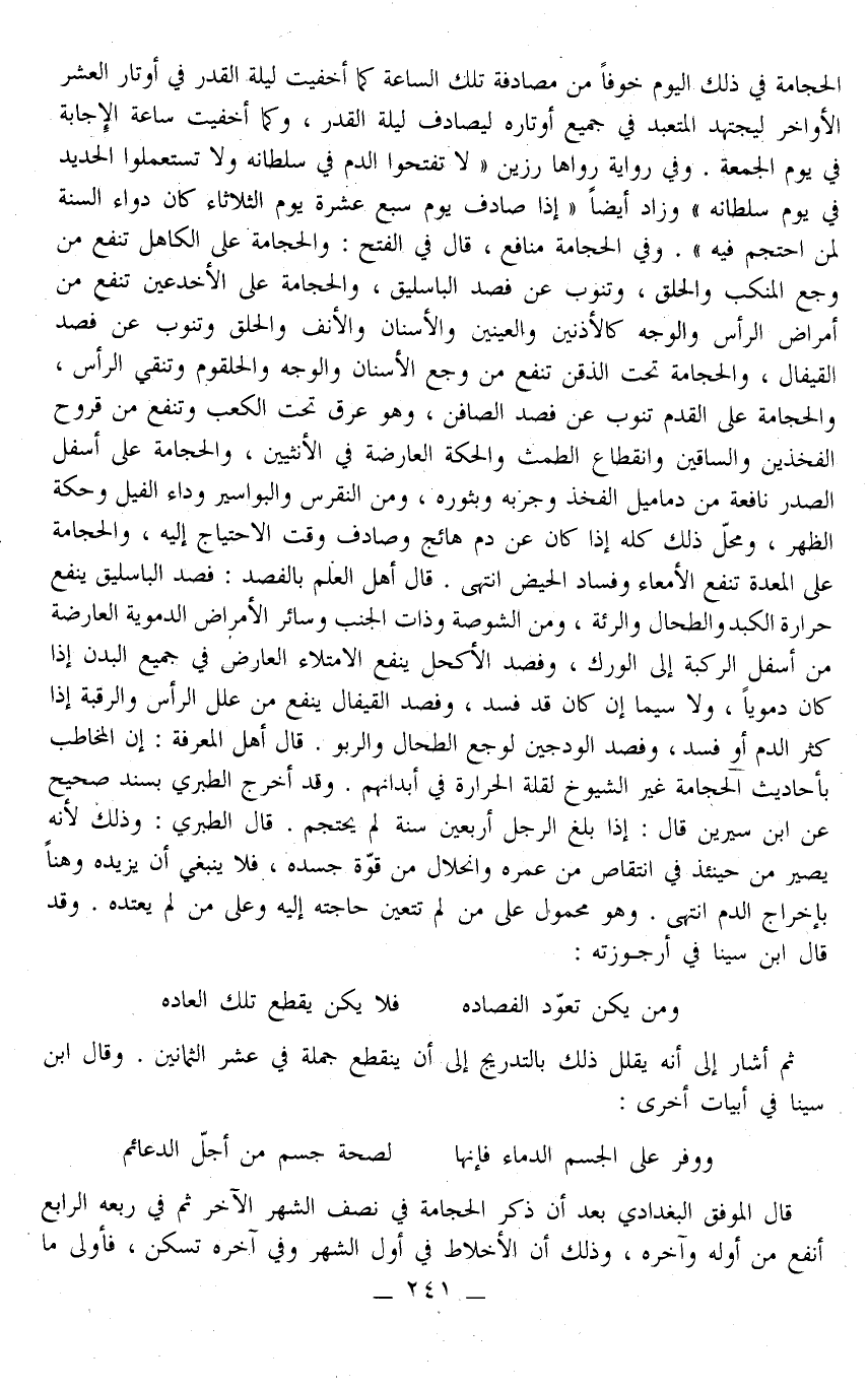 ـــــــــــــــــــــــــــــQالْحِجَامَةُ فِي ذَلِكَ الْيَوْمِ خَوْفًا مِنْ مُصَادَفَةِ تِلْكَ السَّاعَةِ كَمَا أُخْفِيَتْ لَيْلَةُ الْقَدَرِ فِي أَوْتَارِ الْعَشْرِ الْأَوَاخِرِ لِيَجْتَهِدَ الْمُتَعَبِّدُ فِي جَمِيعِ أَوْتَارِهِ لِيُصَادِفَ لَيْلَةَ الْقَدْرِ، وَكَمَا أُخْفِيَتْ سَاعَةُ الْإِجَابَةِ فِي يَوْمِ الْجُمُعَةِ.